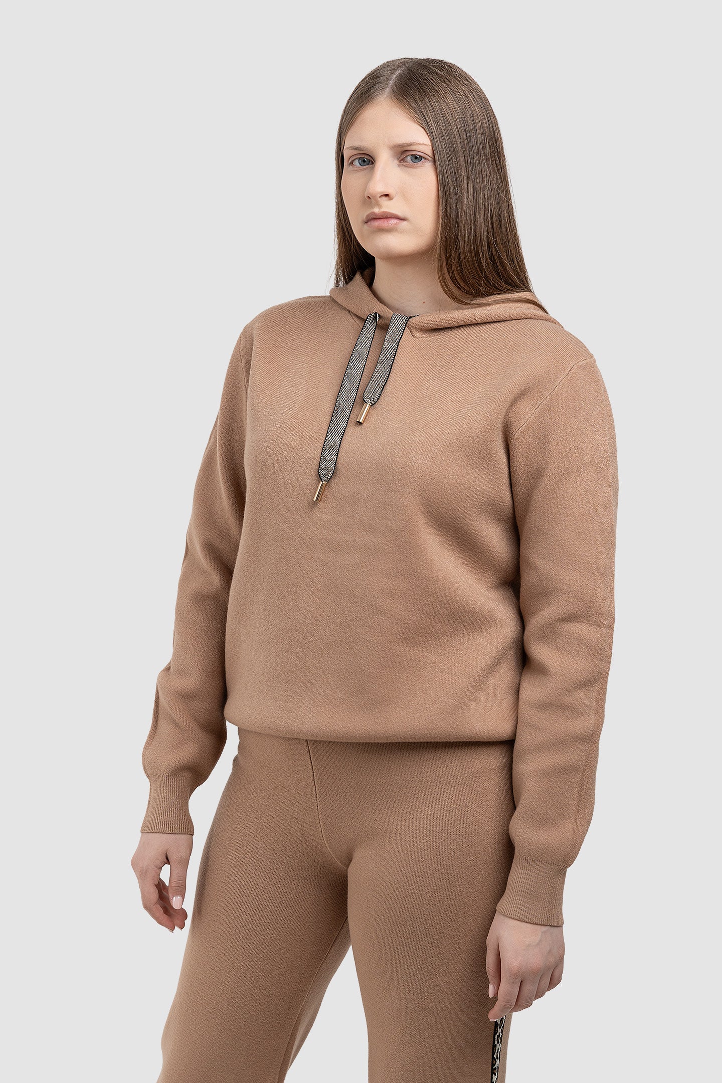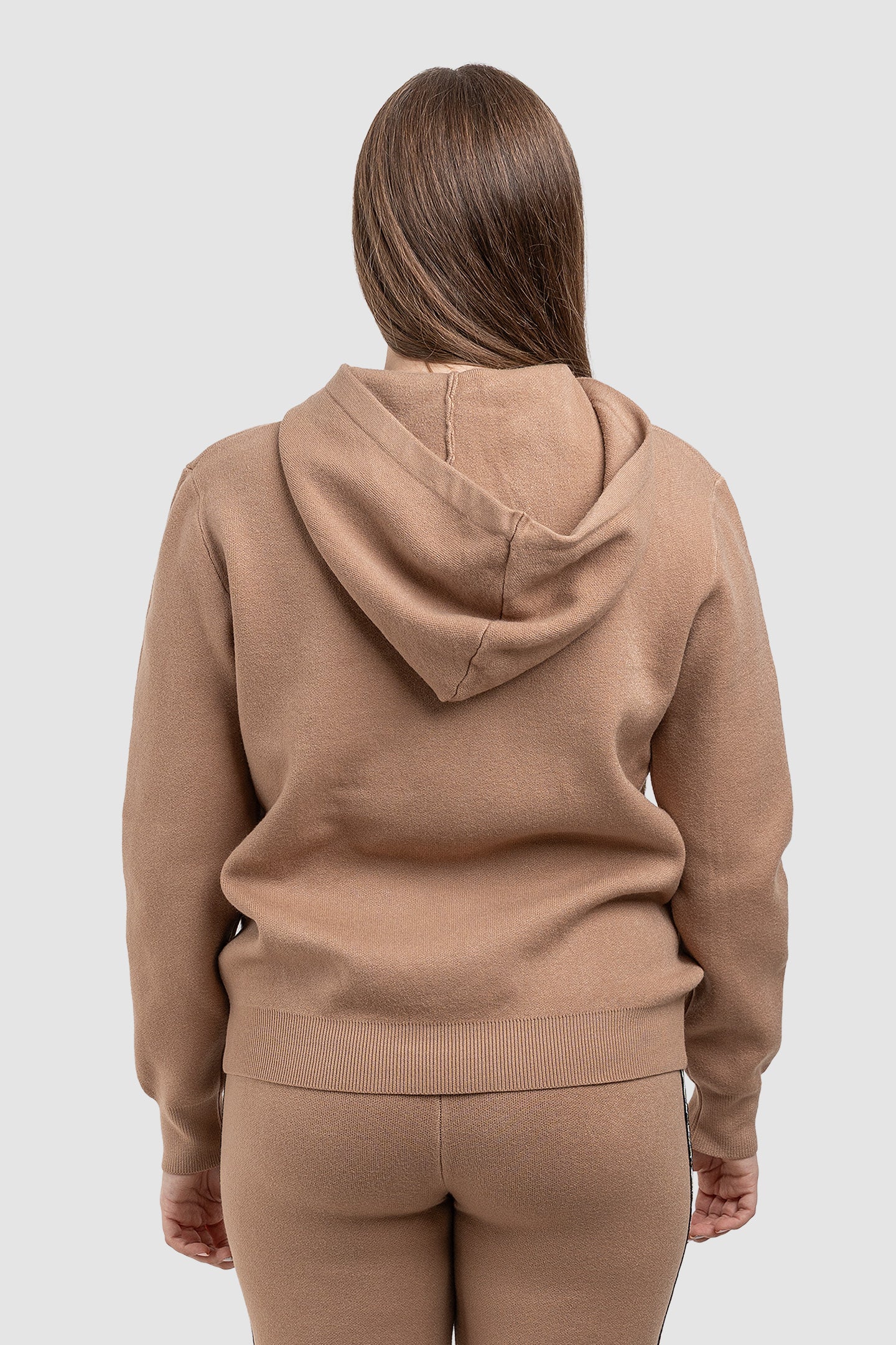 Compleu pentru femei realizat din material tricotat cu textură fină, potrivit pentru sezonul rece. Setul include hanorac cu glugă și pantaloni asortați, oferind un aspect coerent, casual-urban, ușor de integrat în ținute de zi.