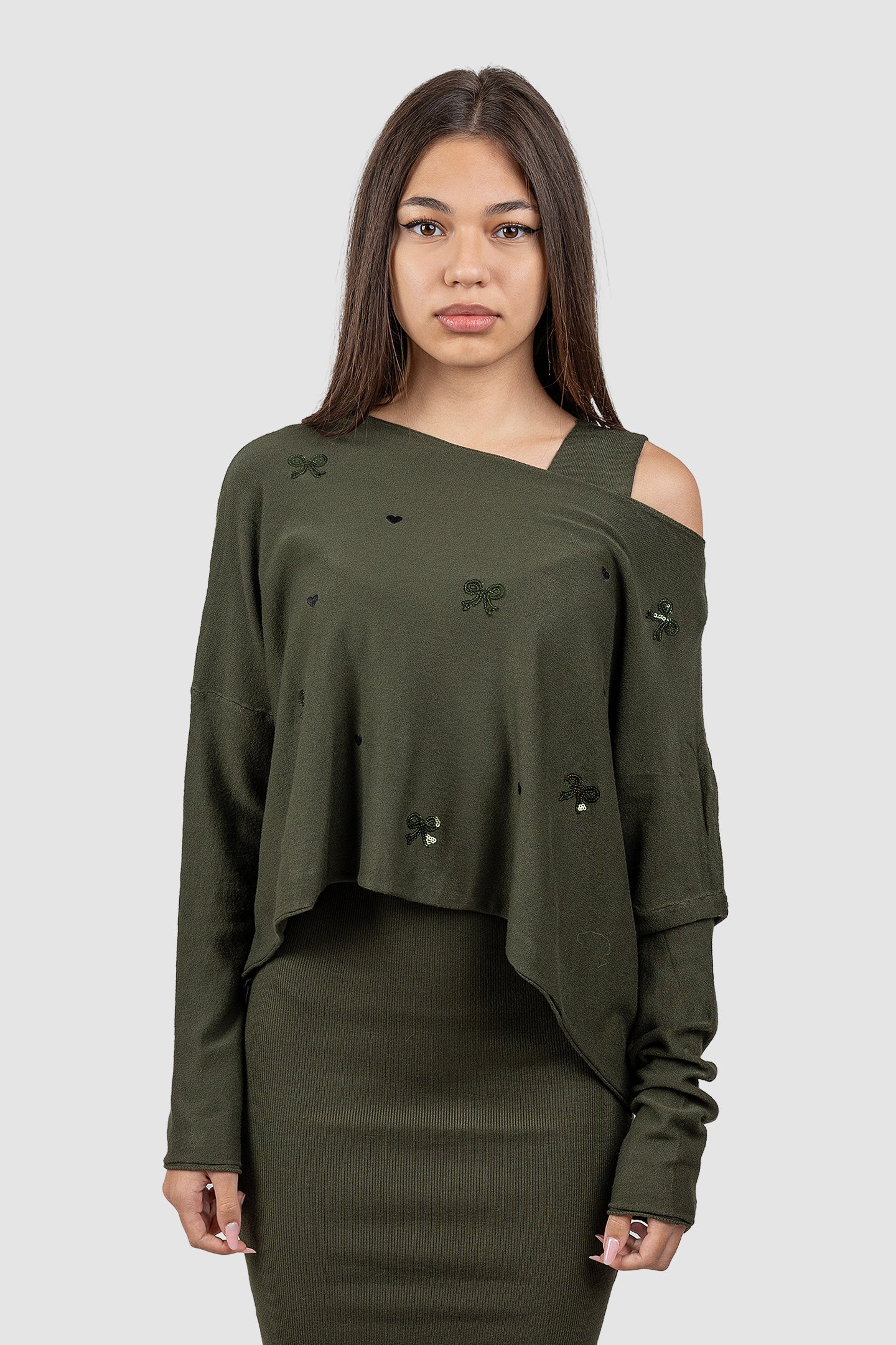 Compleu femei kaki cu top asimetric și fustă midi rib