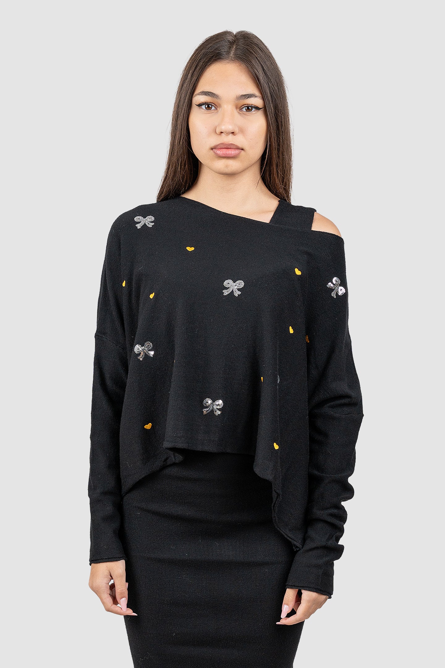 Compleu femei negru cu top asimetric și fustă midi rib