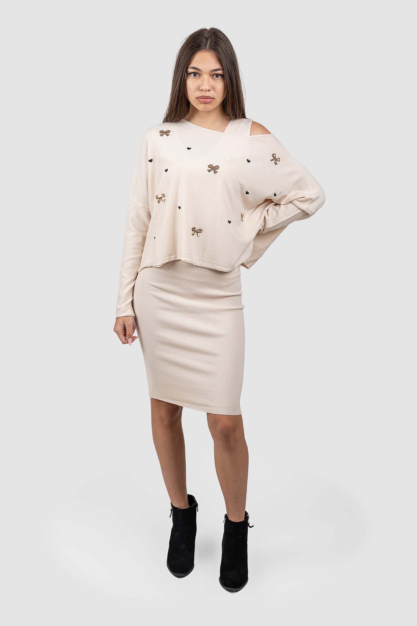 Compleu femei crem cu top asimetric și fustă midi rib