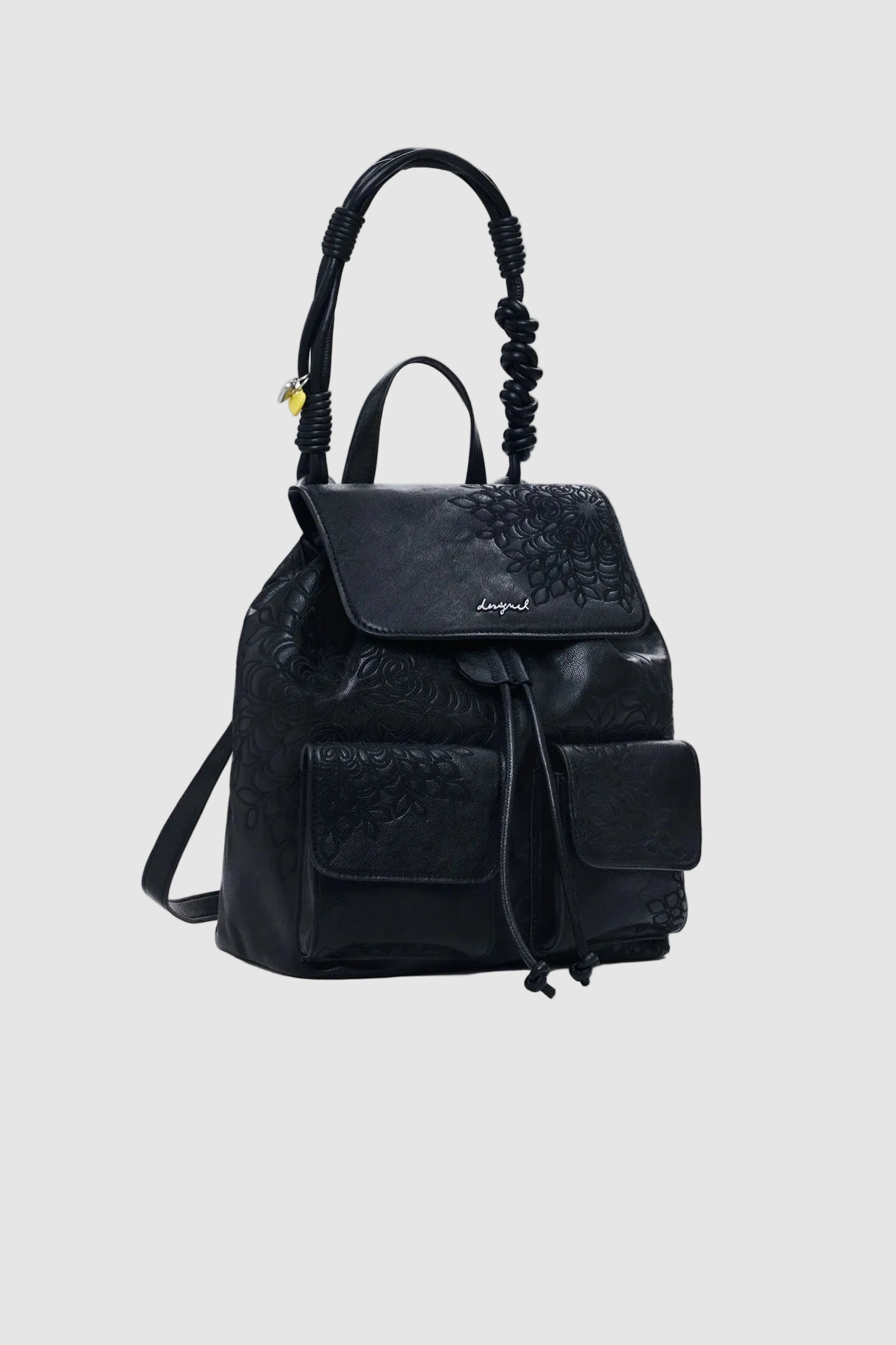 Rucsac femei Desigual negru cu emboss floral și buzunare frontale