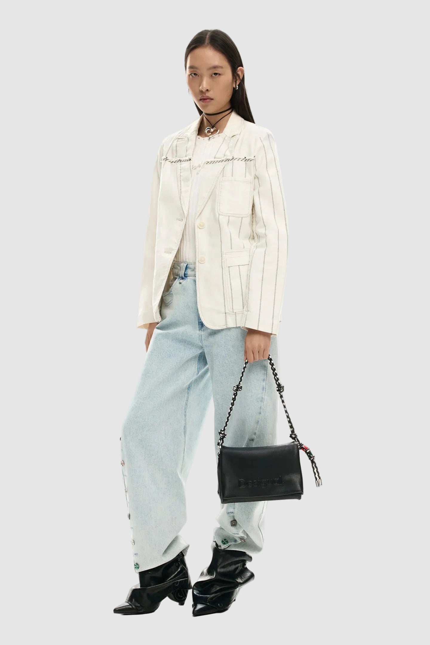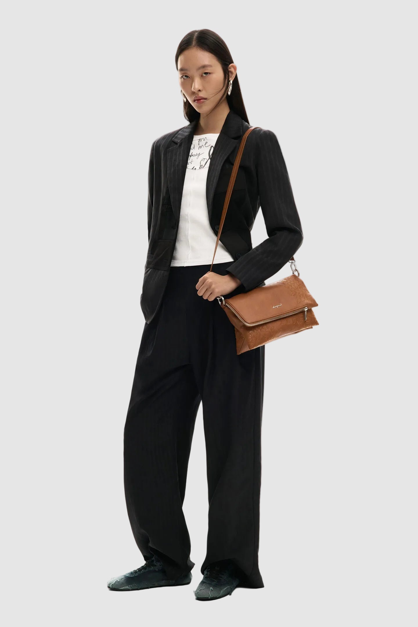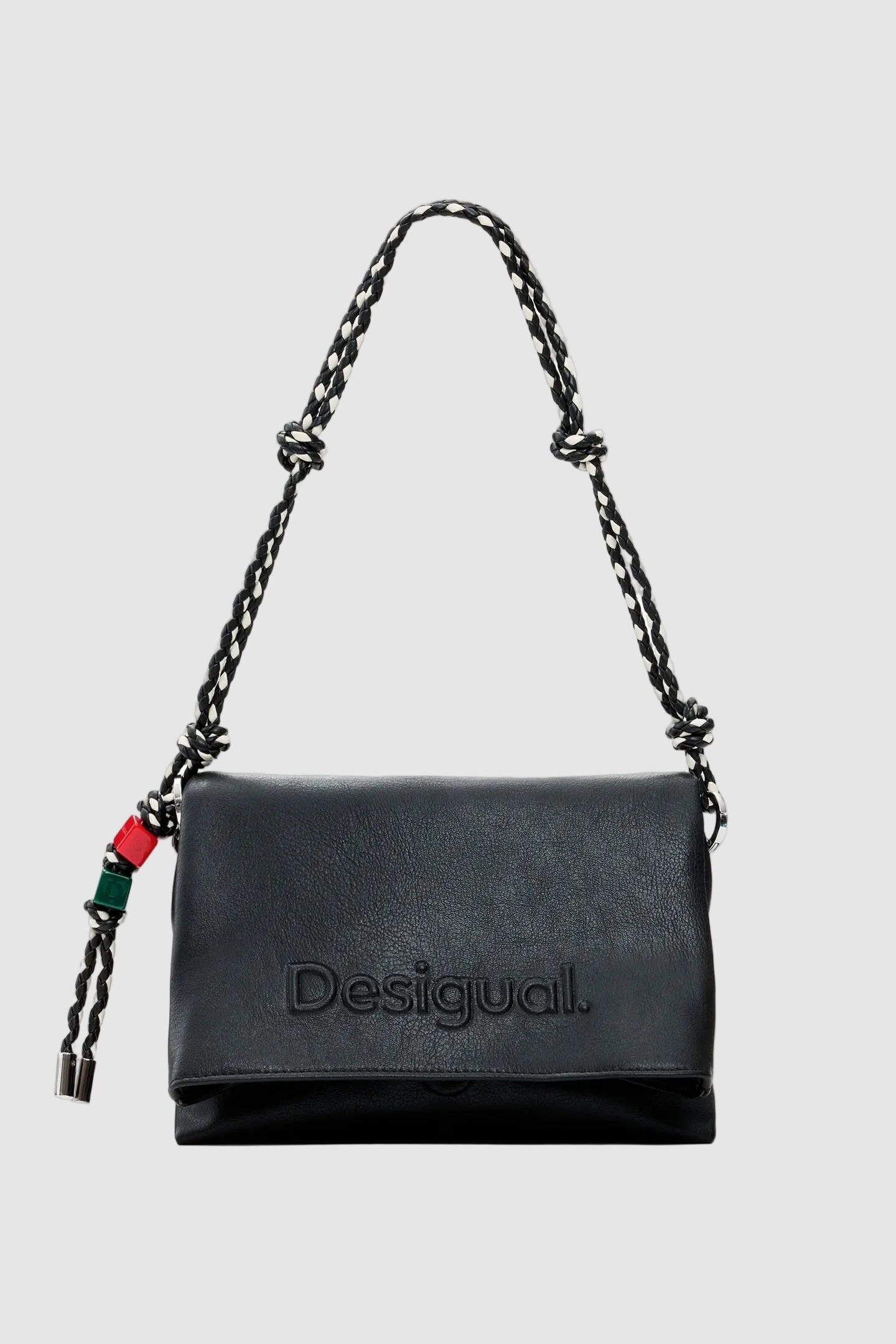Geantă femei Desigual neagră cu logo embosat și curea împletită
