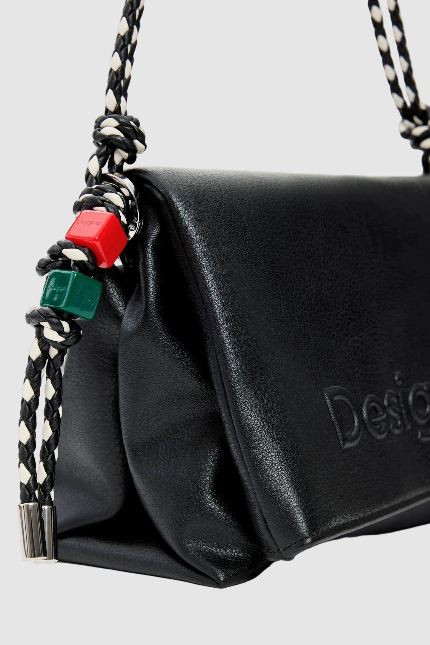 Detalii de design: logo Desigual embosat frontal, clapetă frontală, curea lungă împletită alb-negru, elemente decorative colorate pe curea, finisaje metalice discrete
