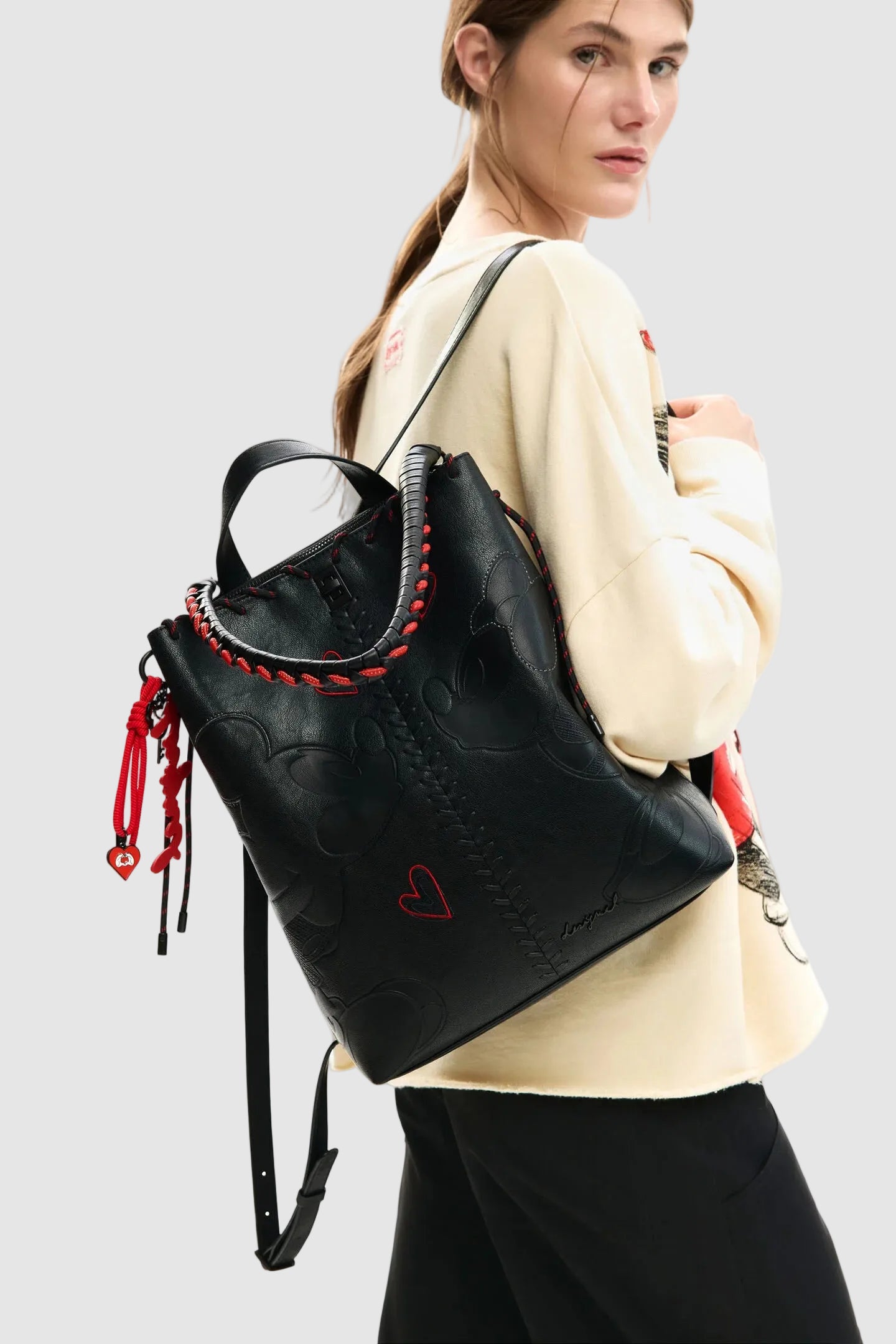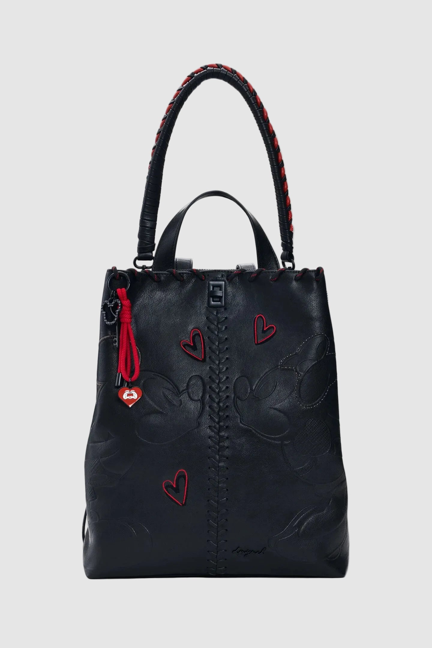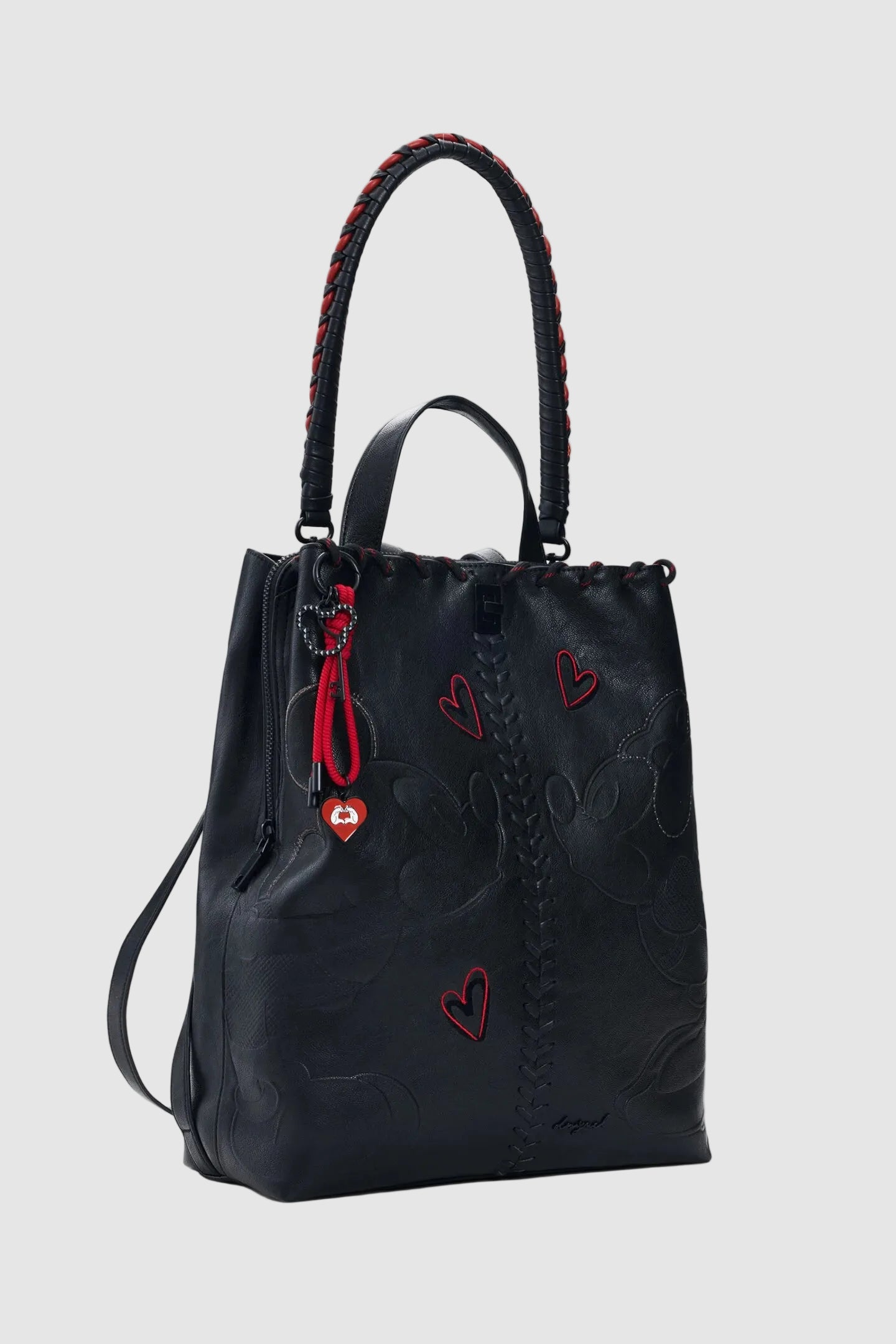 Detalii de design: cusături decorative centrale, aplicații inimă roșii, curea împletită cu detalii contrastante, mâner superior pentru transport, logo Desigual aplicat discret