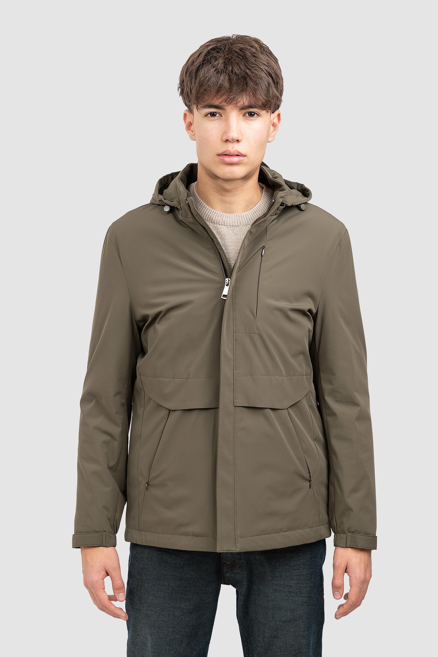 Geacă bărbați cu glugă și croială dreaptă, kaki