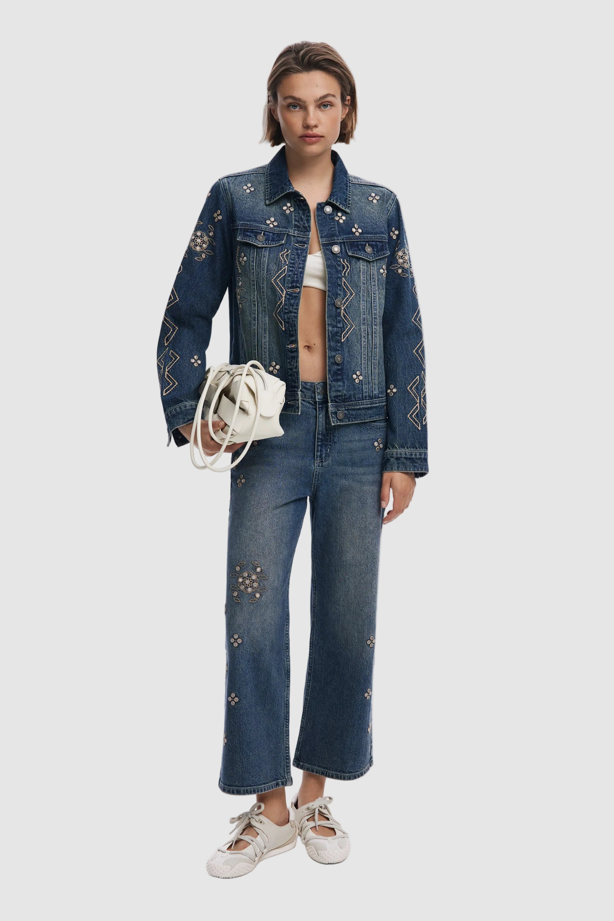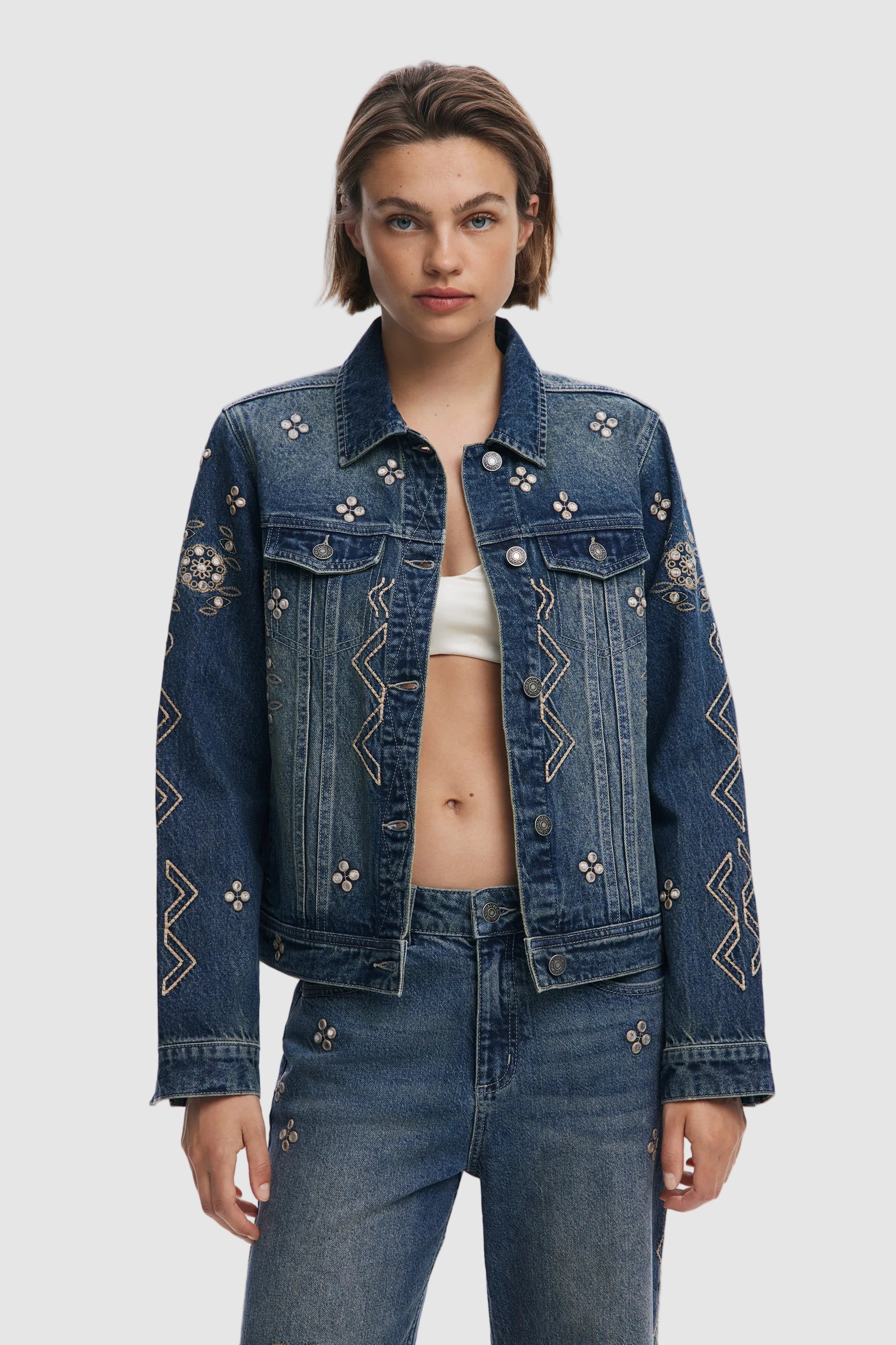 Geacă denim Desigual damă cu broderii decorative și buzunare, albastru