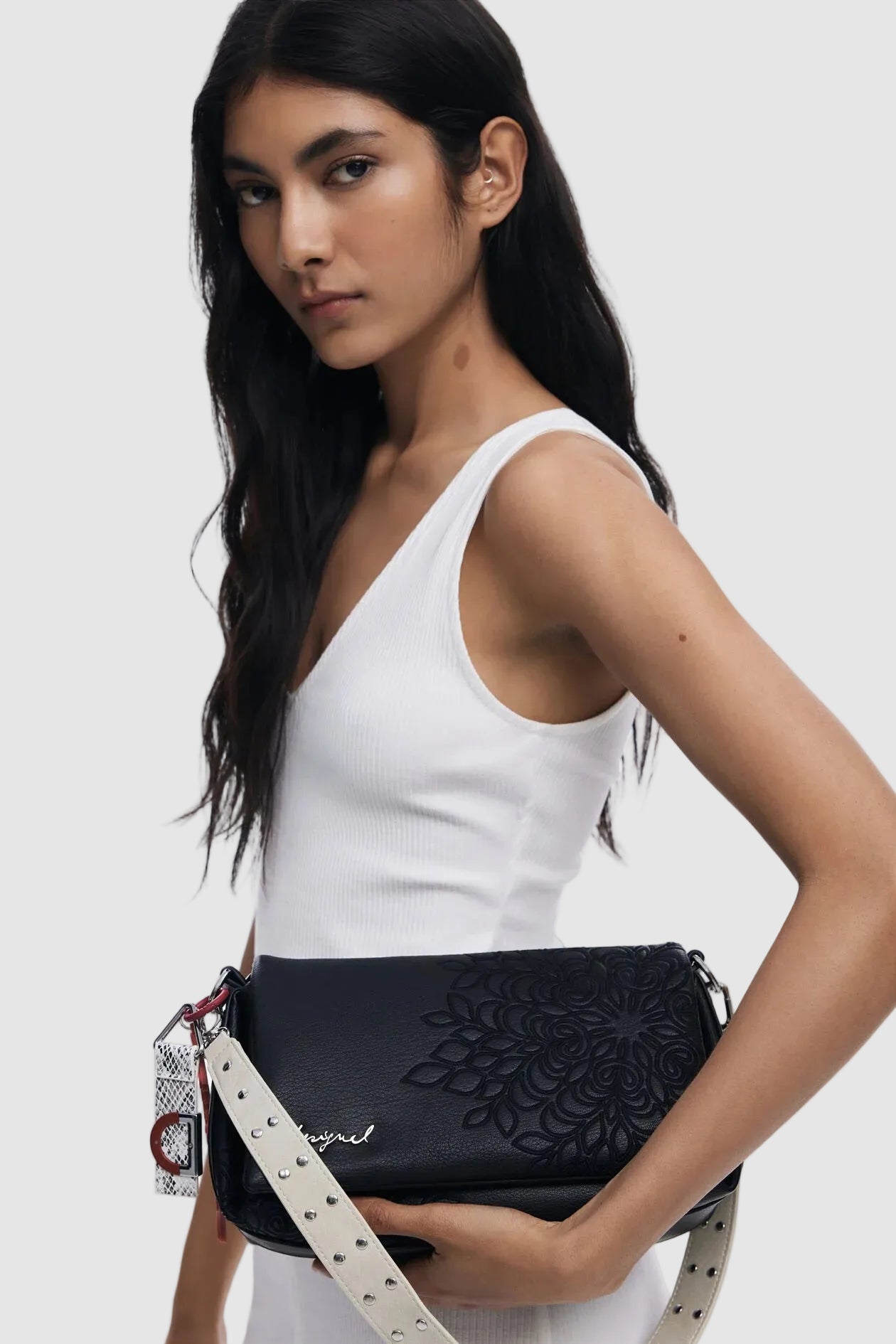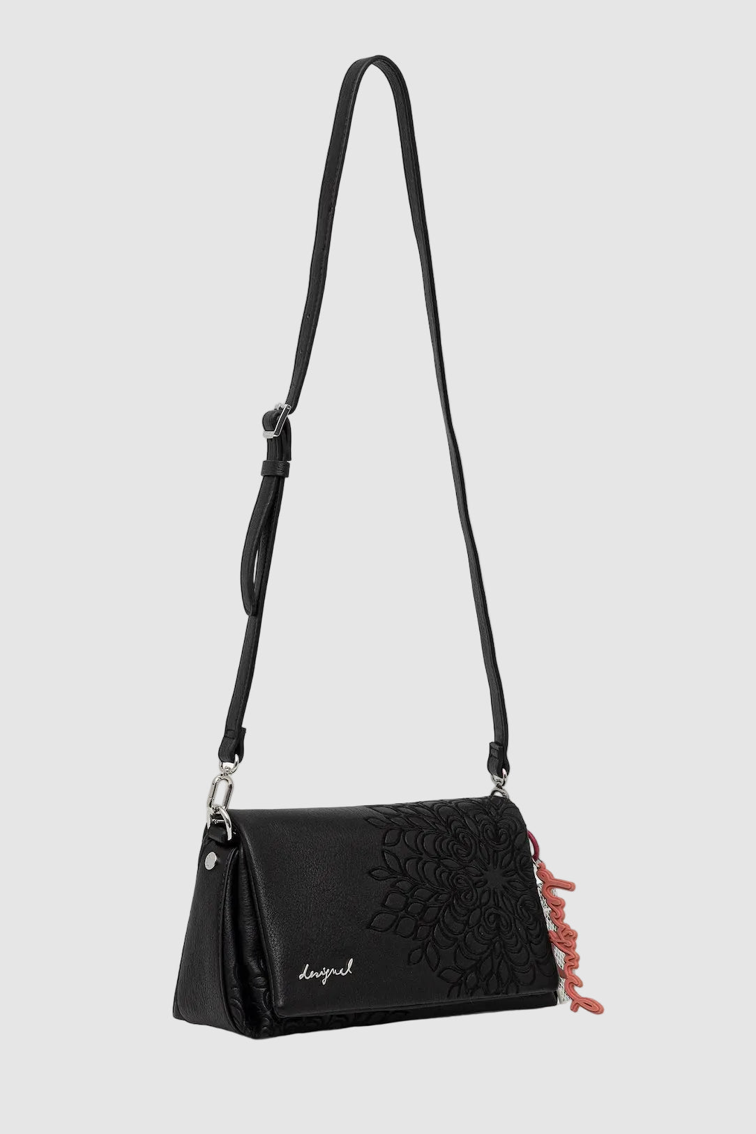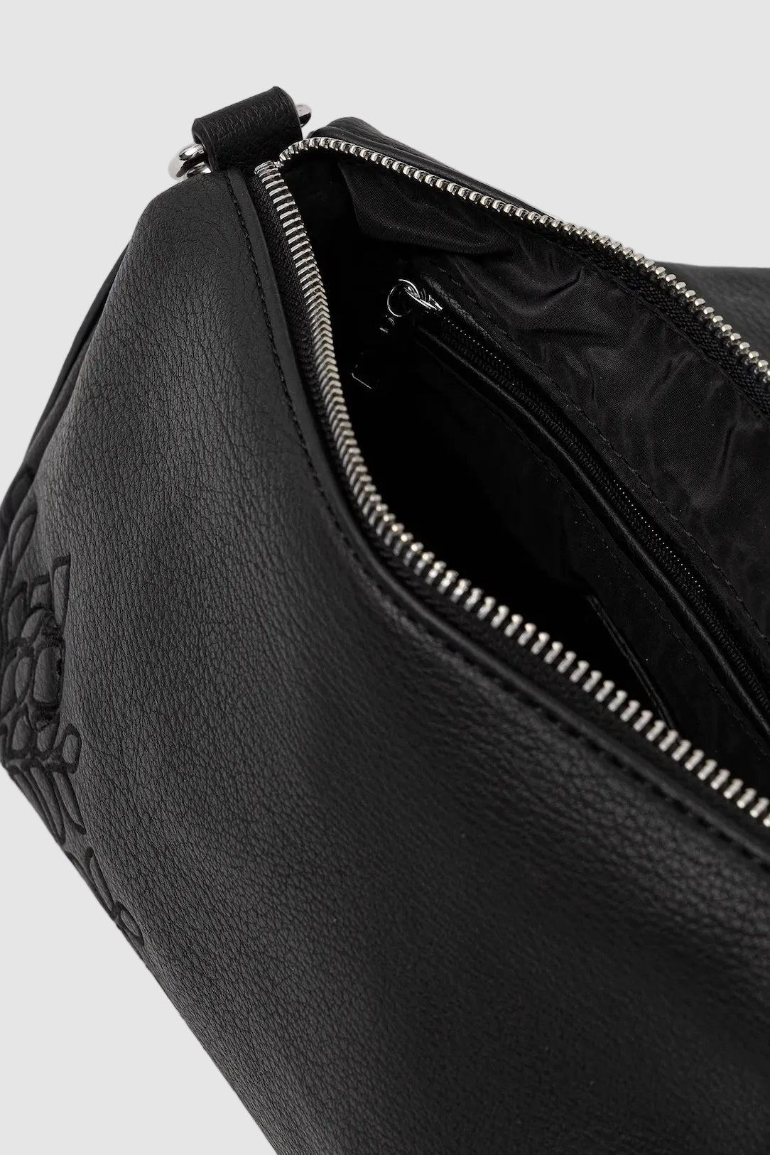 Poșetă pentru femei Desigual, realizată integral din poliuretan cu finisaj neted, concepută pentru utilizare zilnică în mediul urban. Forma structurată și culoarea neagră permit integrarea facilă în ținute casual sau smart-casual.