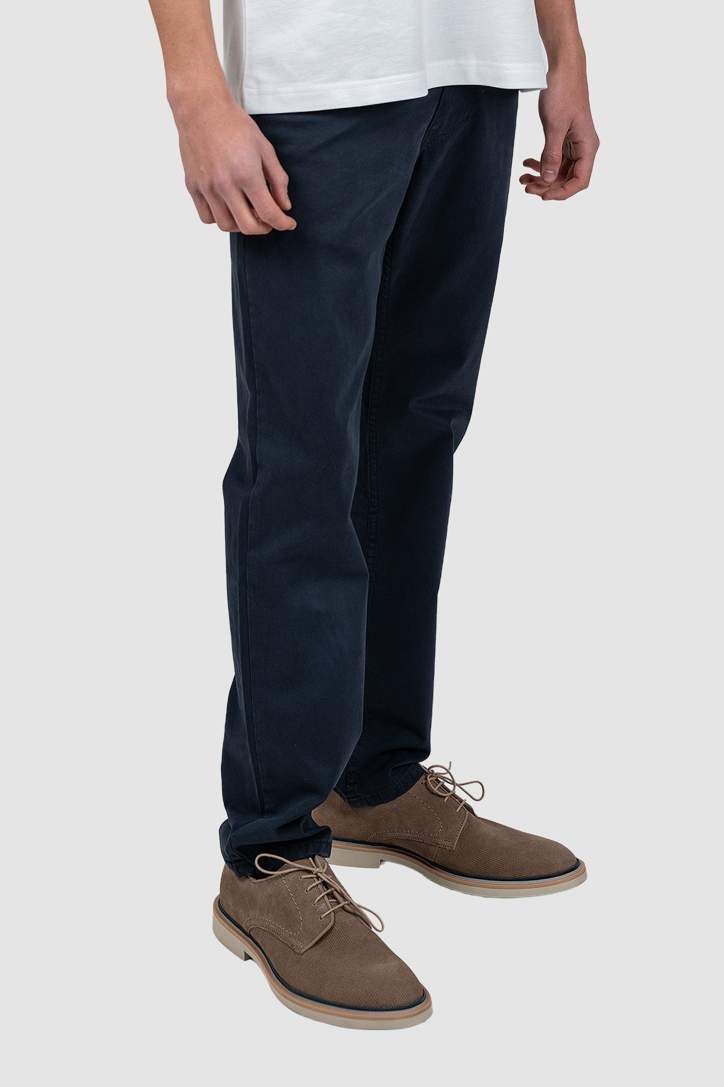 Aspectul curat, fără efecte pronunțate de prespălare, evidențiază linia clasică a pantalonului. Construcția standard cu 5 buzunare și materialul cu elasticitate moderată oferă confort și libertate de mișcare în utilizarea zilnică.