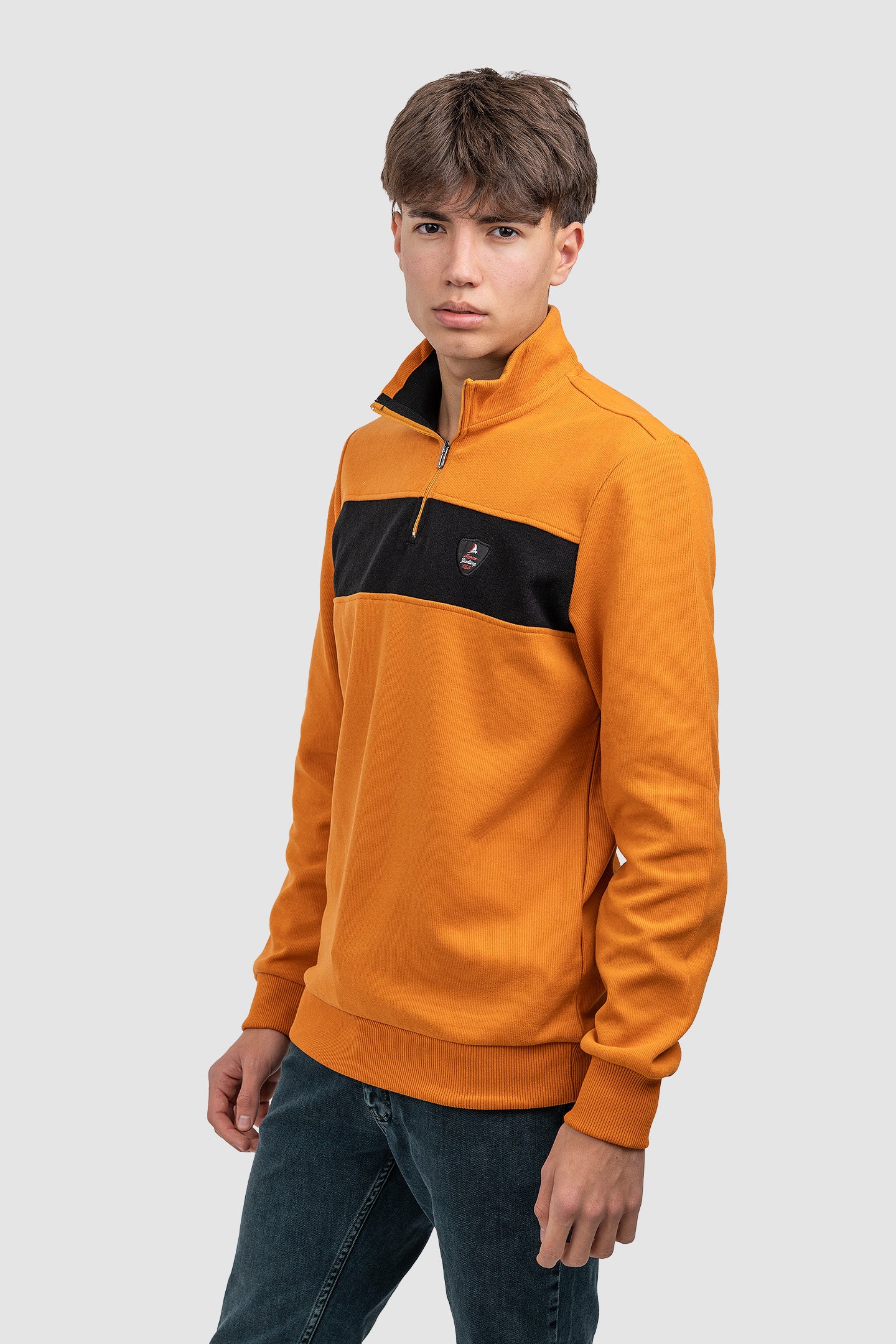 Modelul prezintă o croială regular, cu guler înalt și închidere cu fermoar scurt. Banda orizontală contrastantă aplicată pe piept, împreună cu emblema discretă brodată, oferă un accent vizual clar, fără a încărca estetic produsul. Finisajele elastice de la manșete și tiv contribuie la confort și stabilitate la purtare.