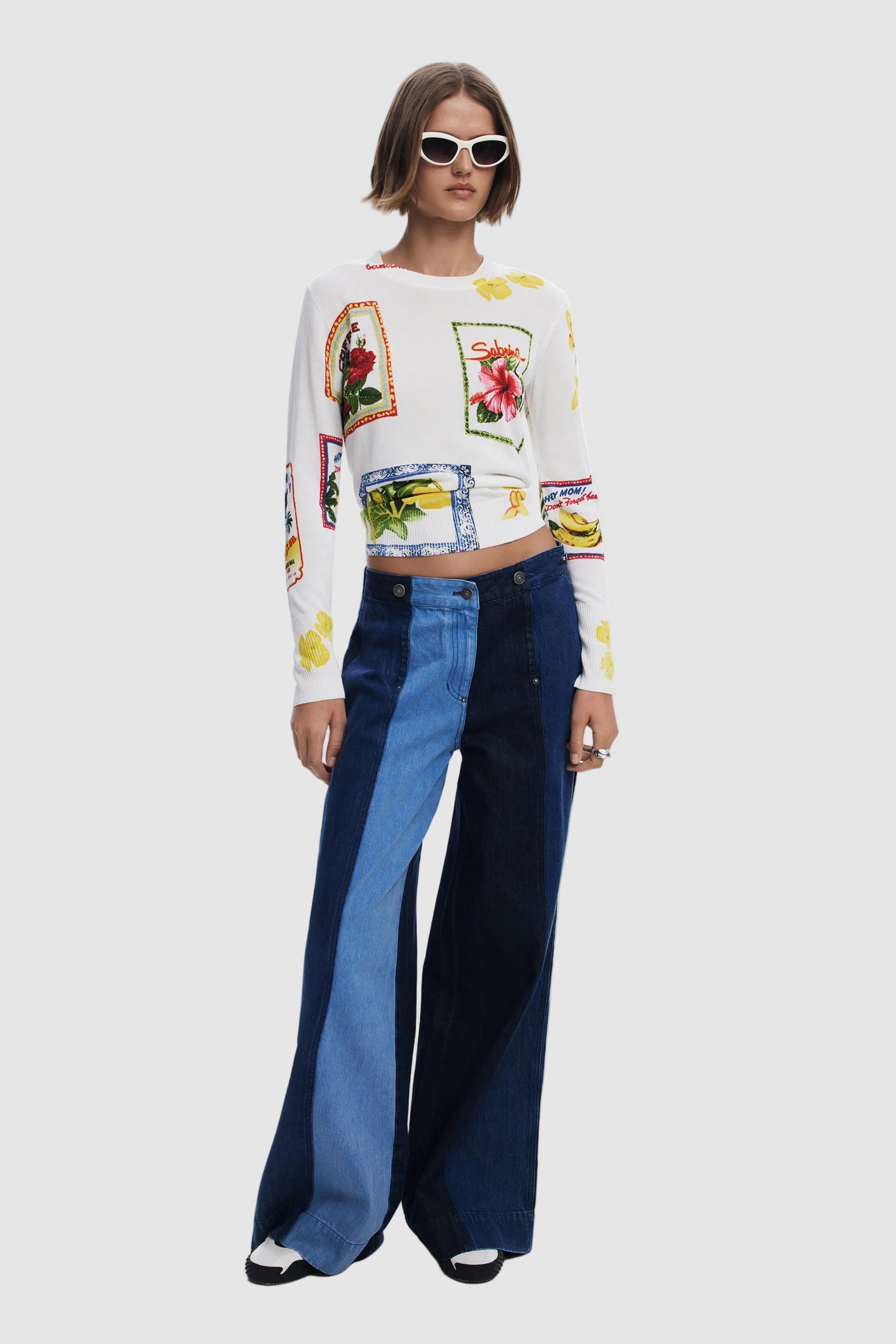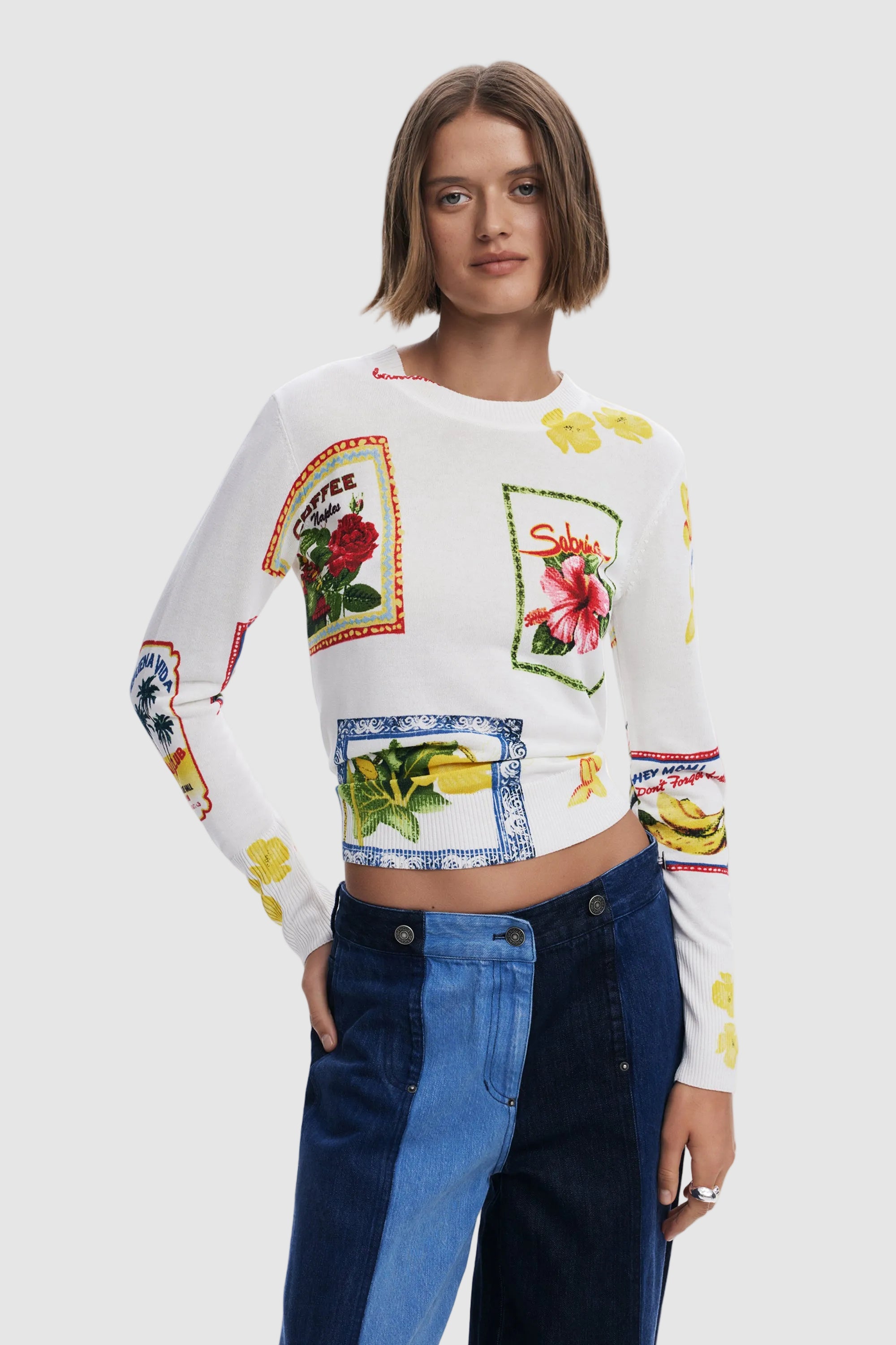 Pulover damă Desigual scurt cu imprimeu grafic, mânecă lungă, alb