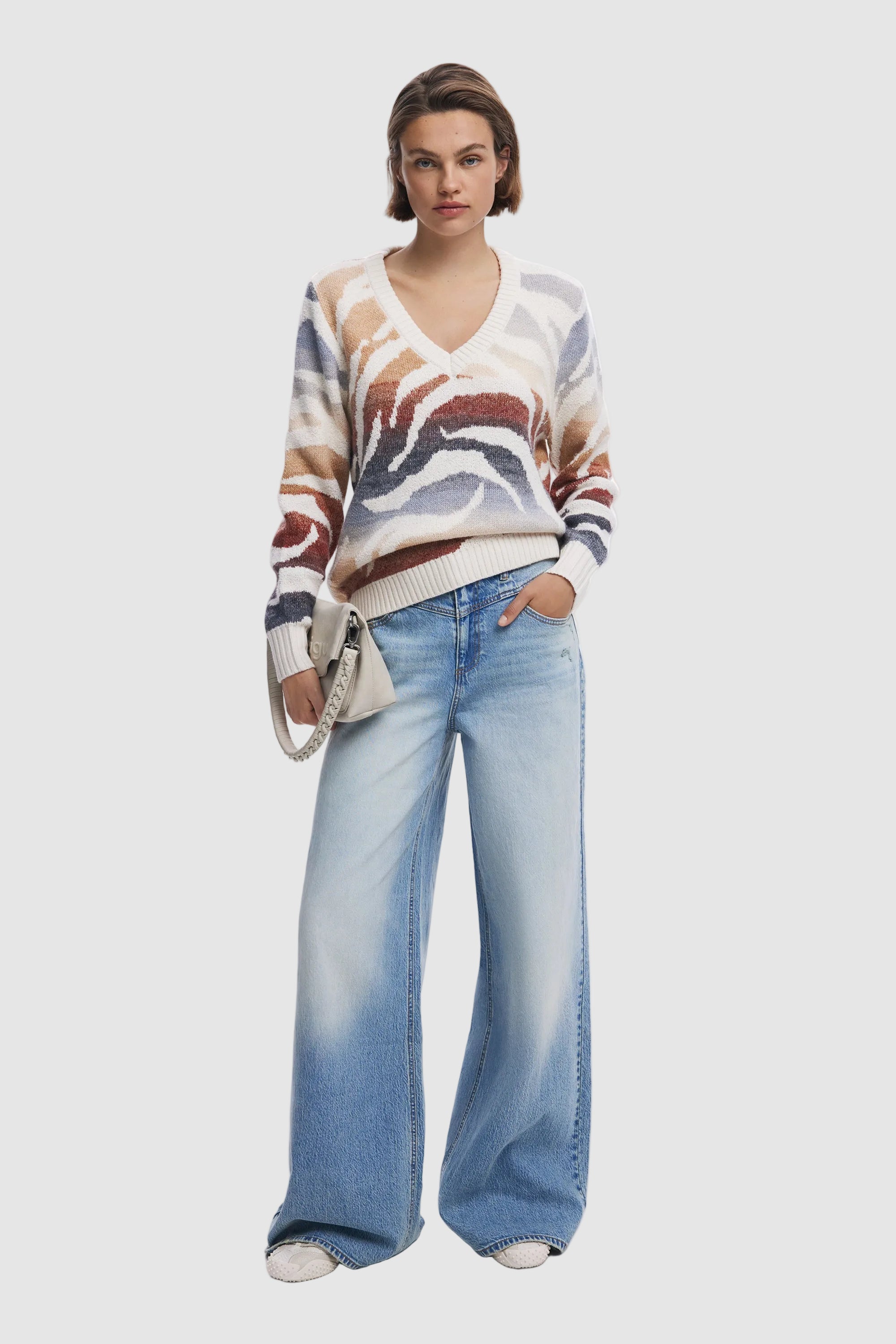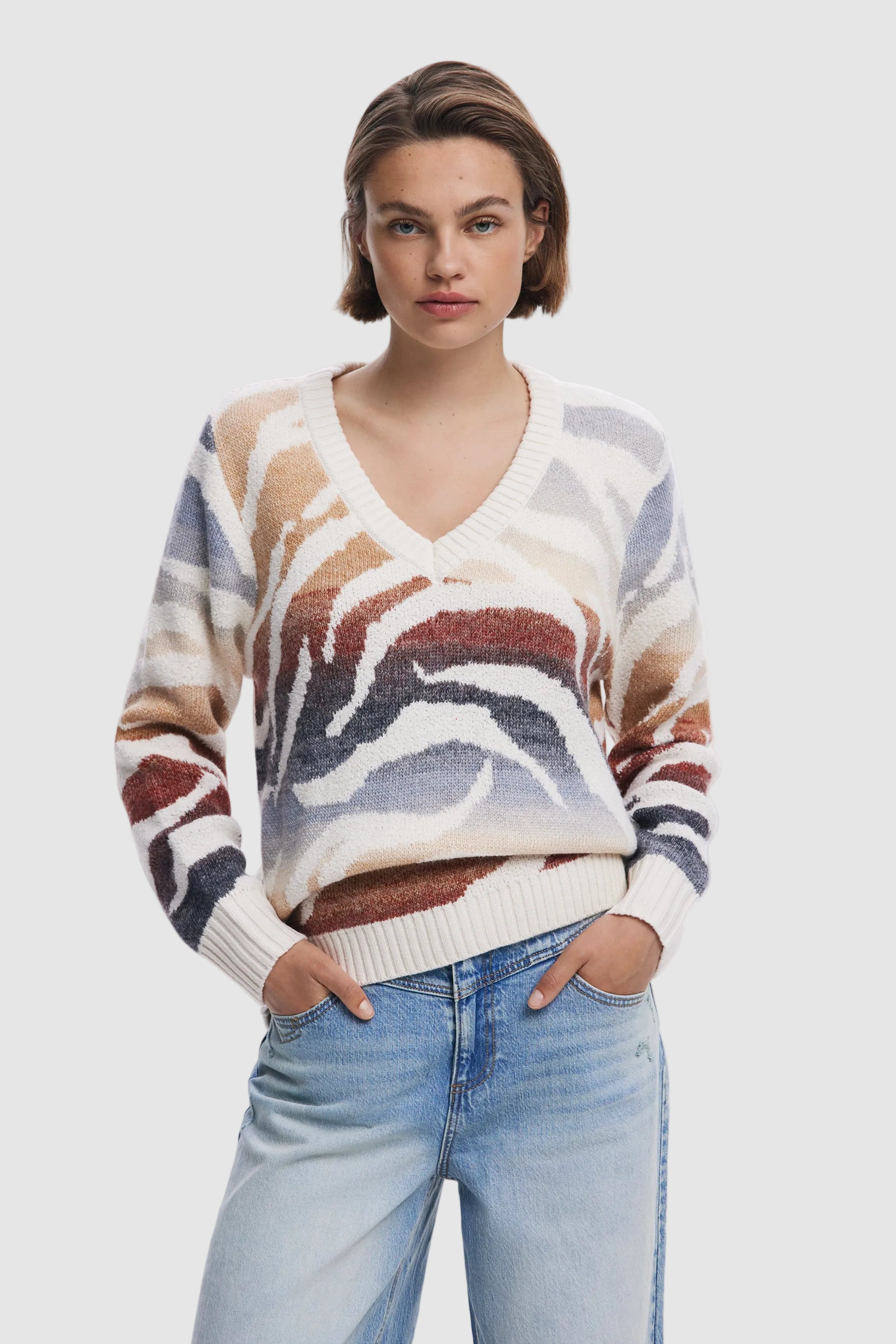 Pulover damă Desigual cu decolteu în V și imprimeu abstract, crem mix