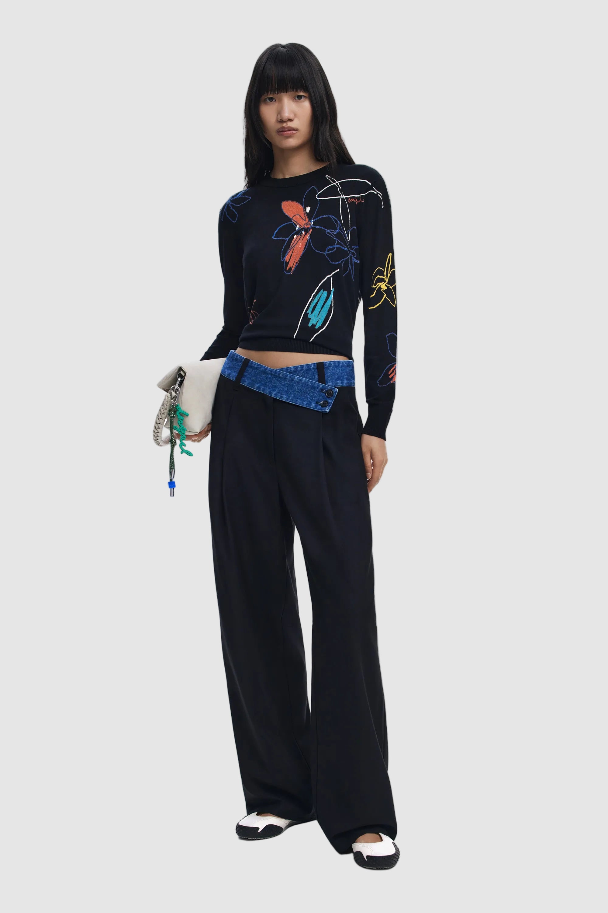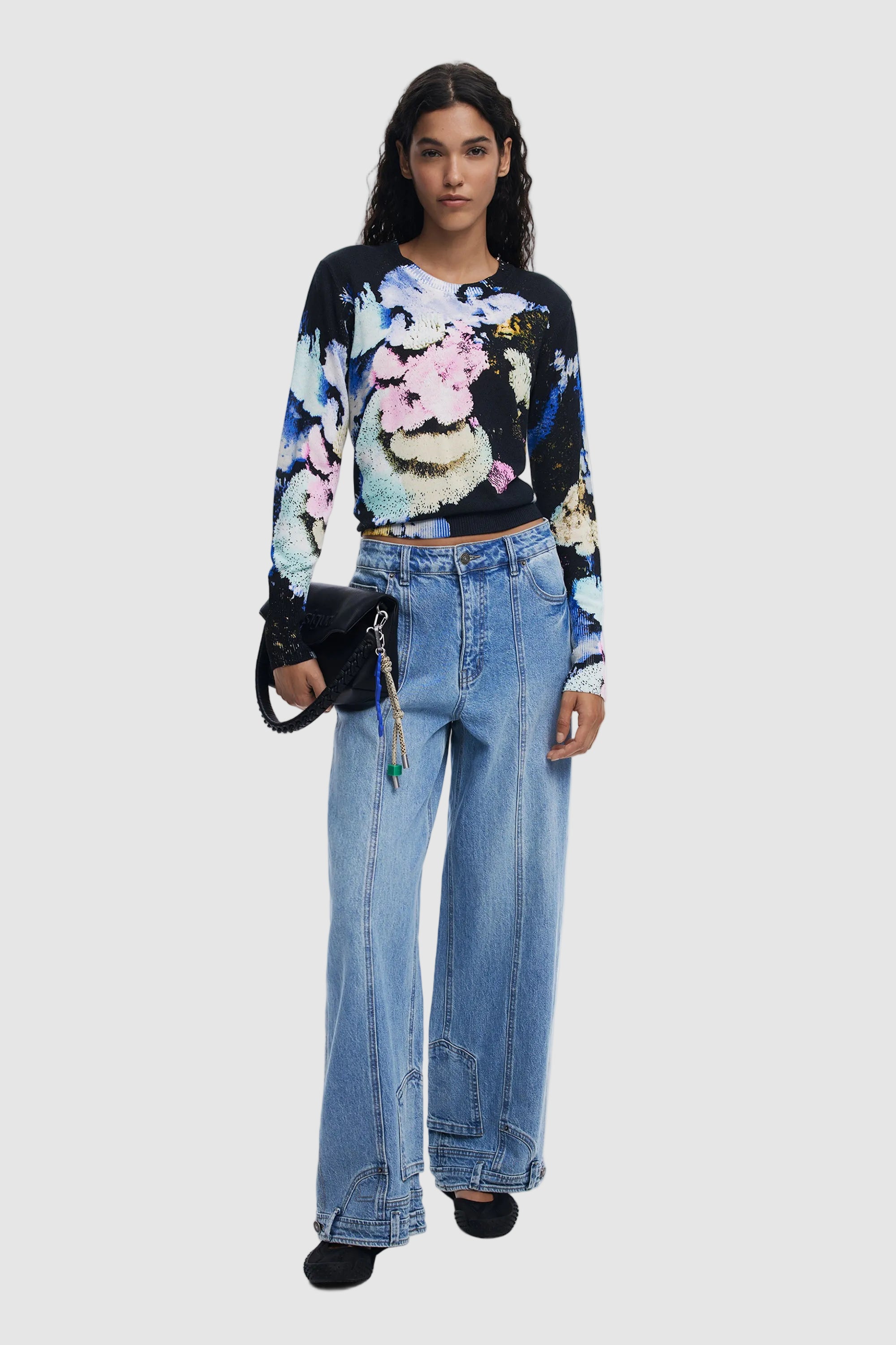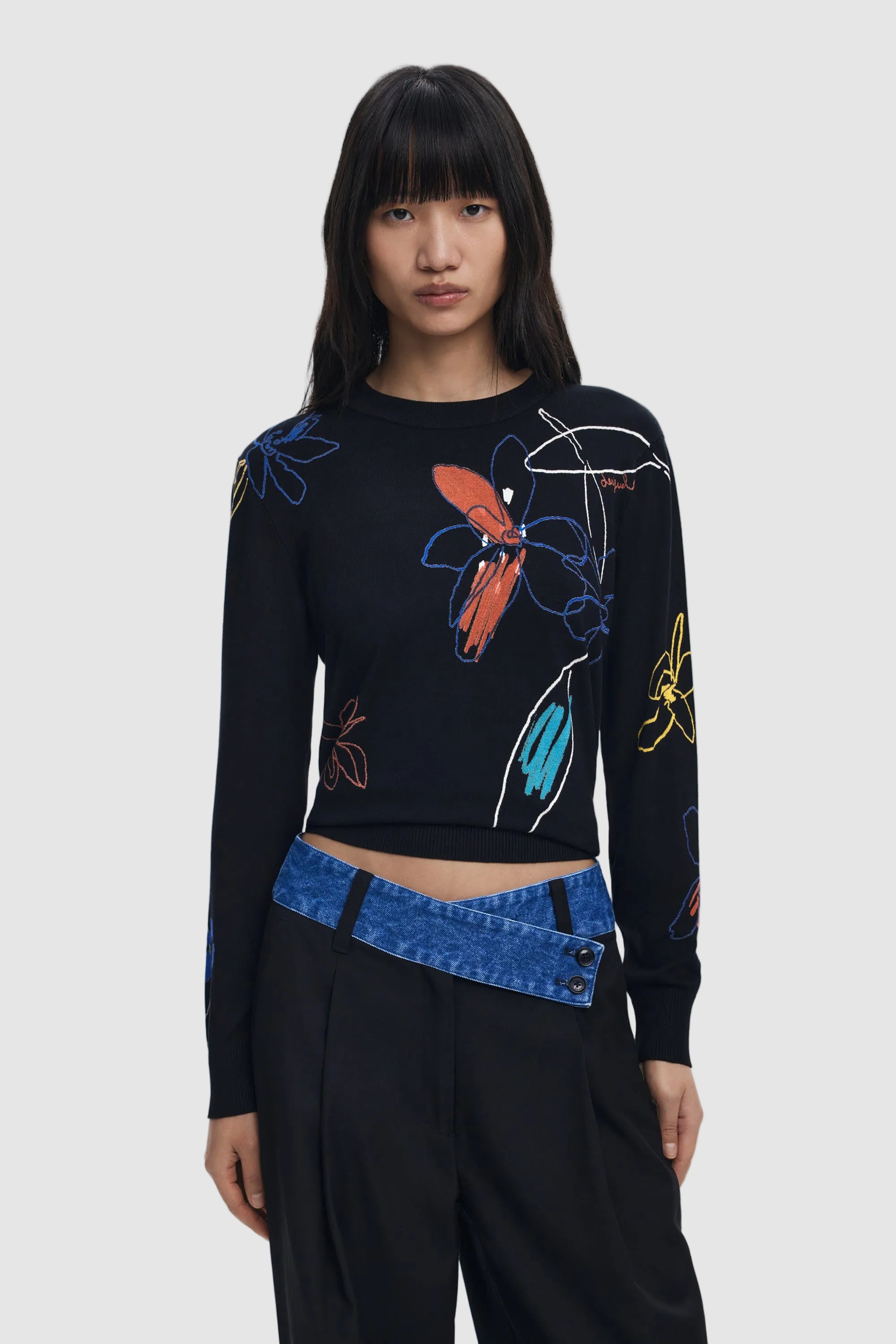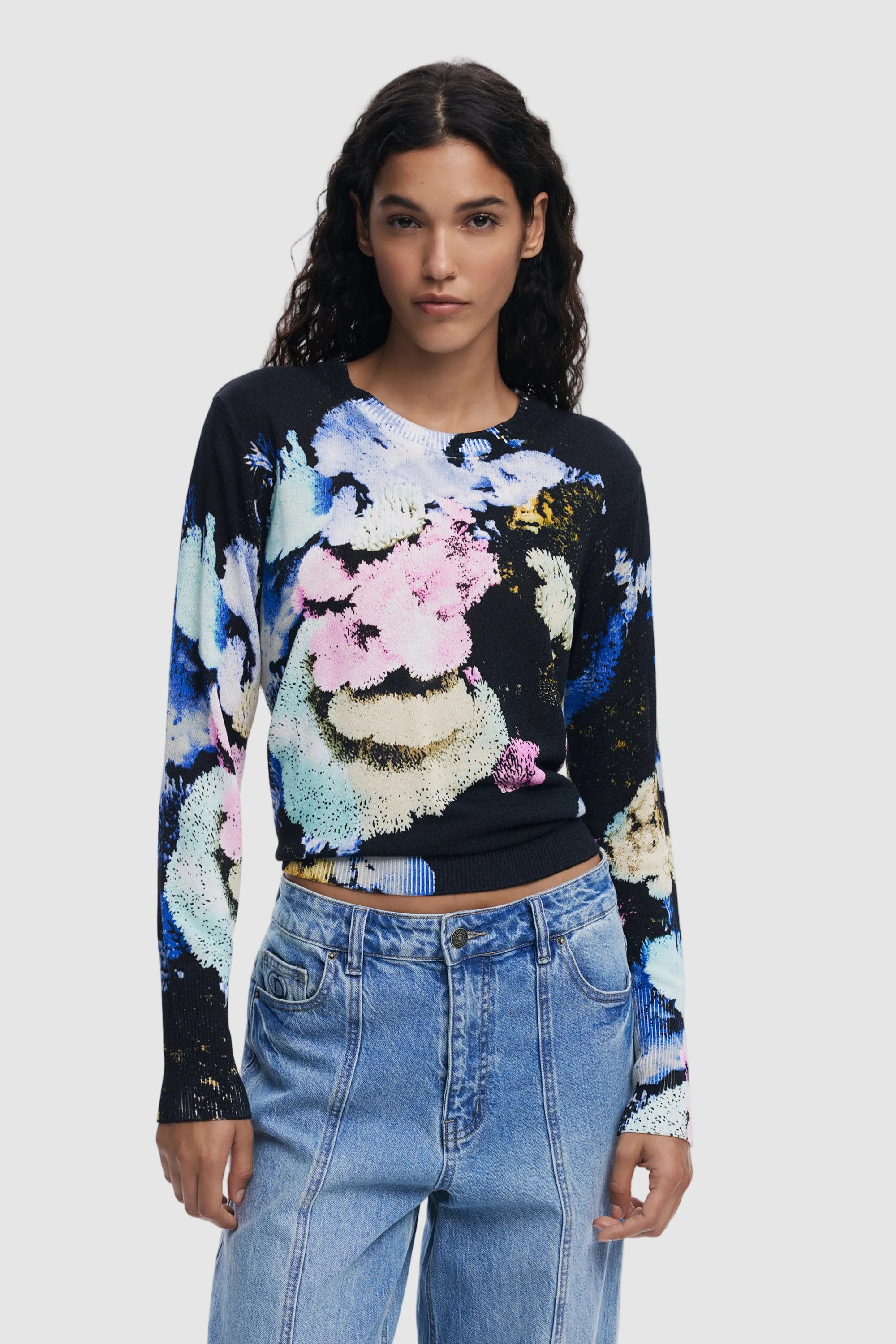 Pulover damă Desigual cu imprimeu floral abstract, croială scurtă, negru