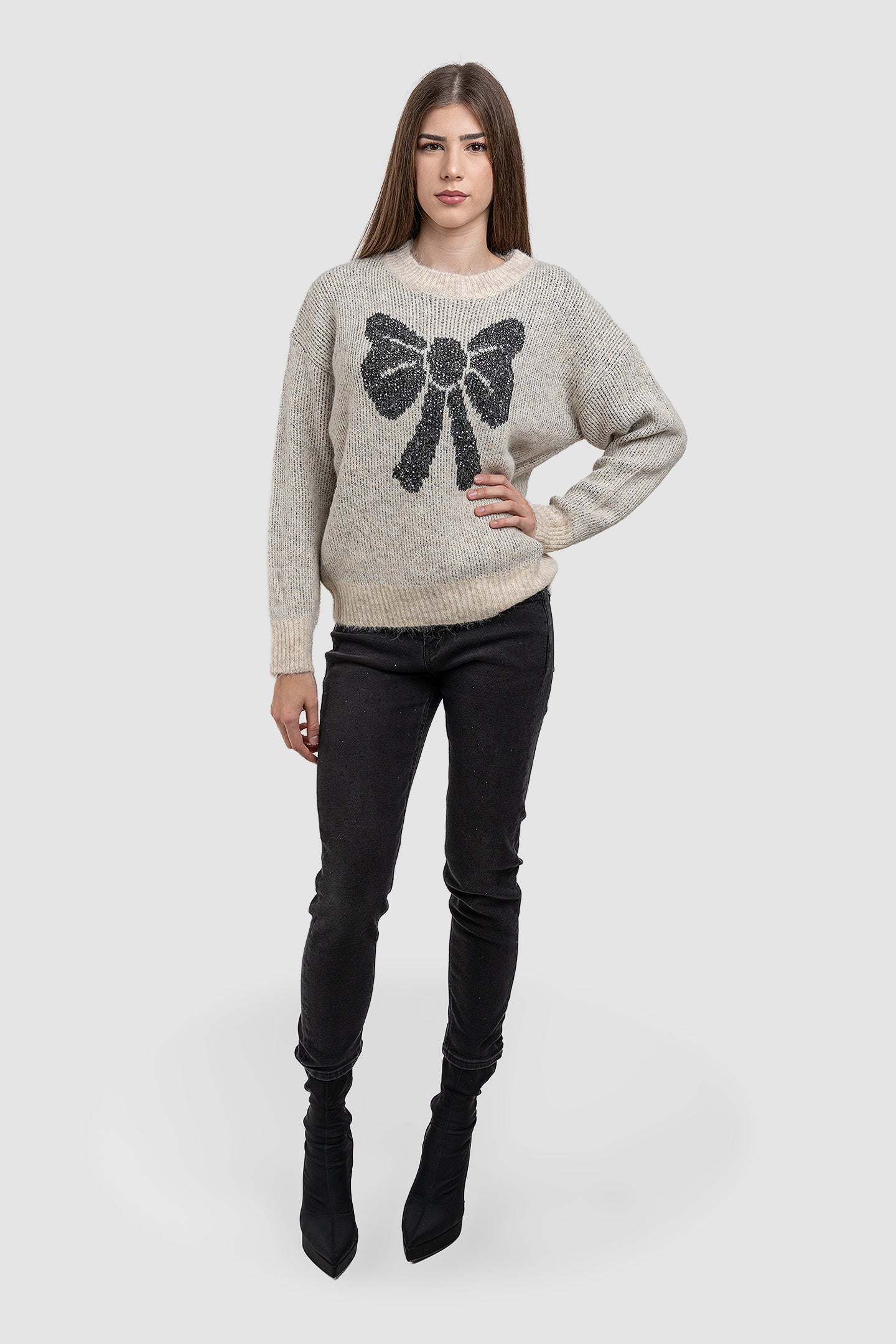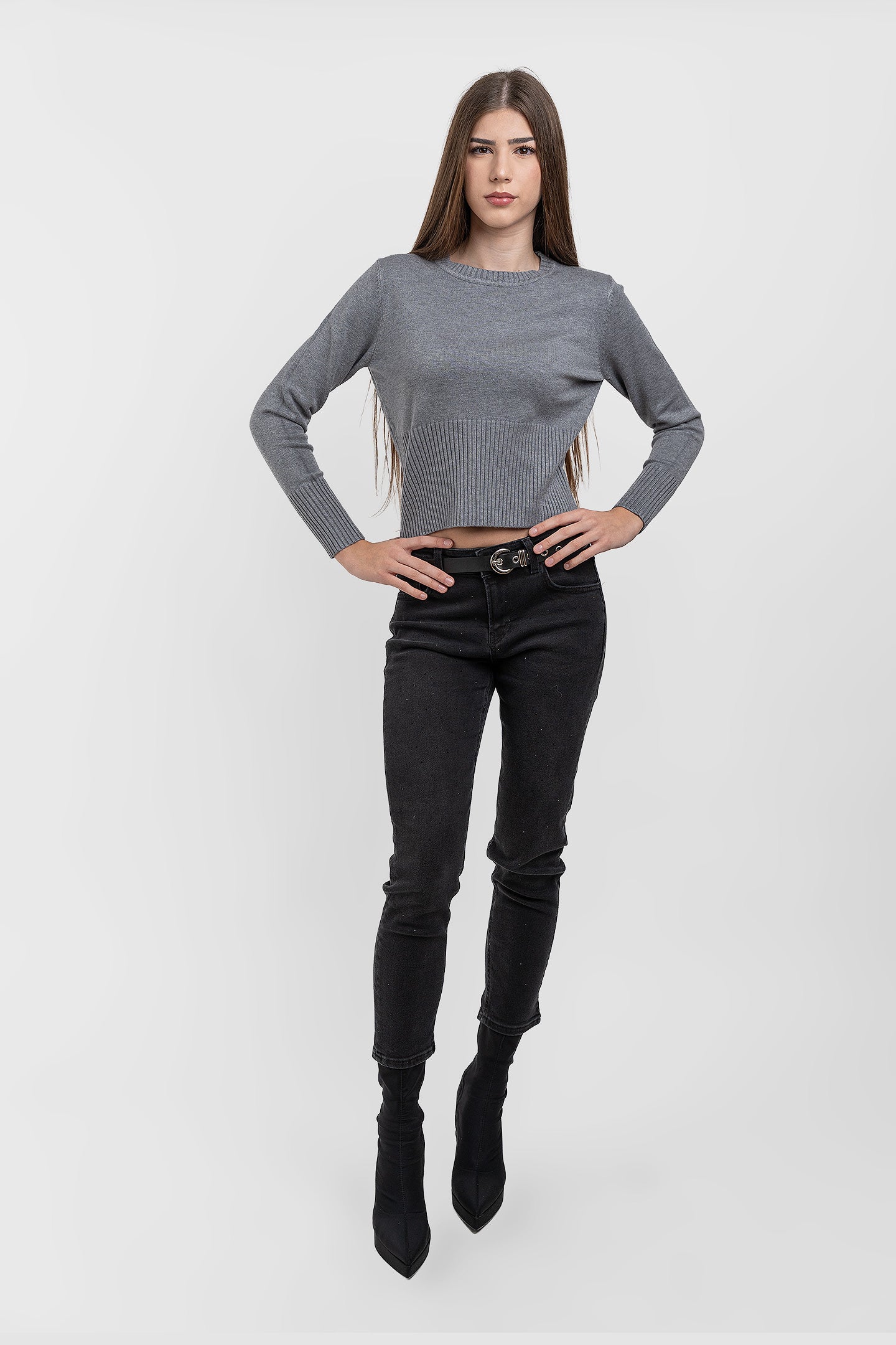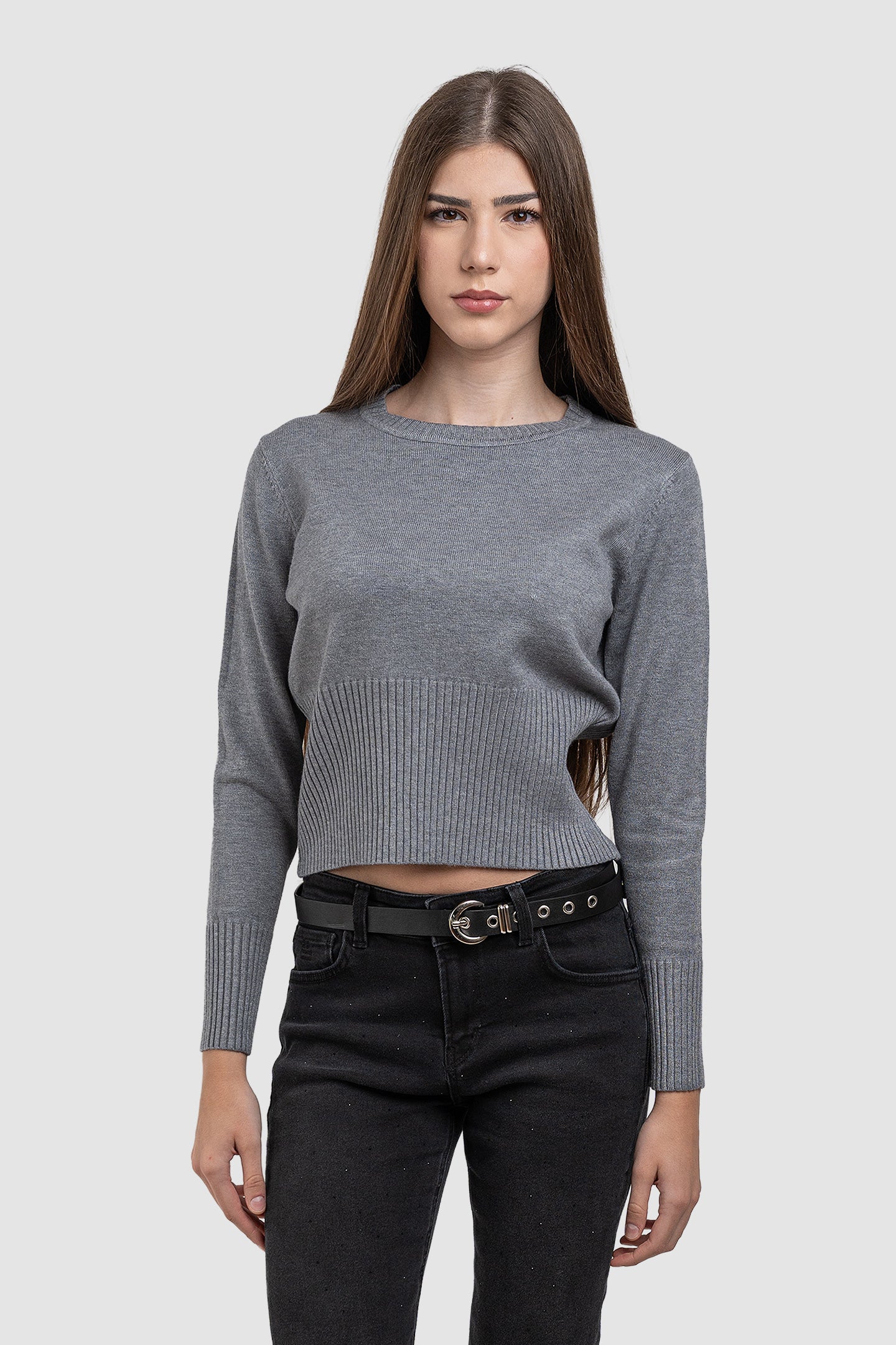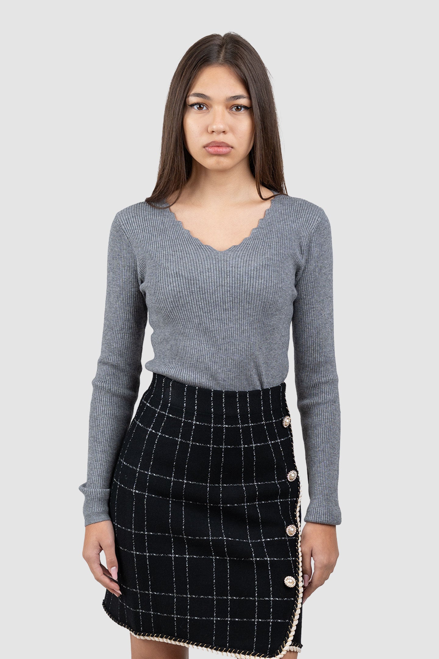 Pulover de damă gri pentru iarnă, cu nervuri și decolteu în V cu margini ondulate