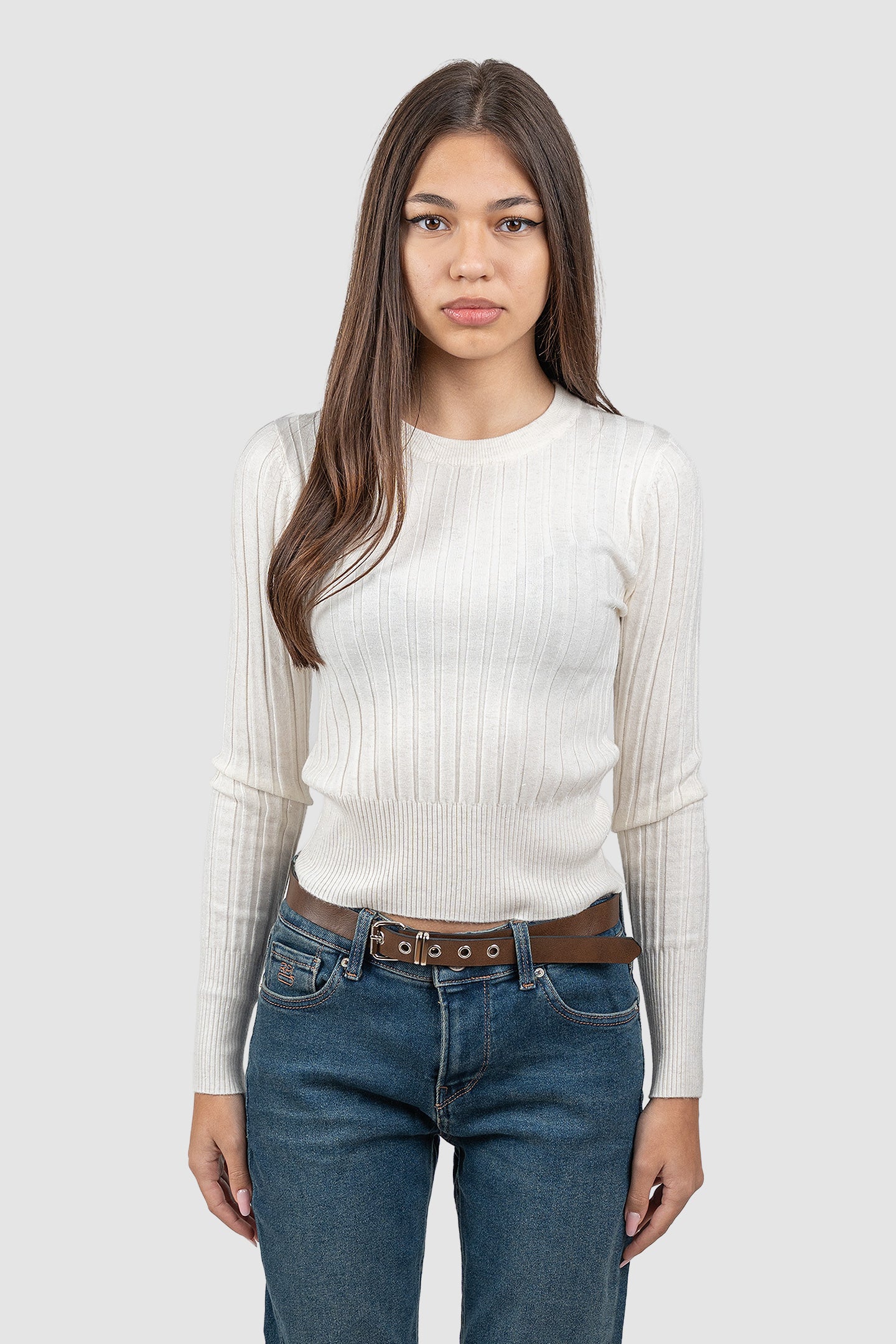Pulover femei cu nervuri verticale și fir discret lurex, alb