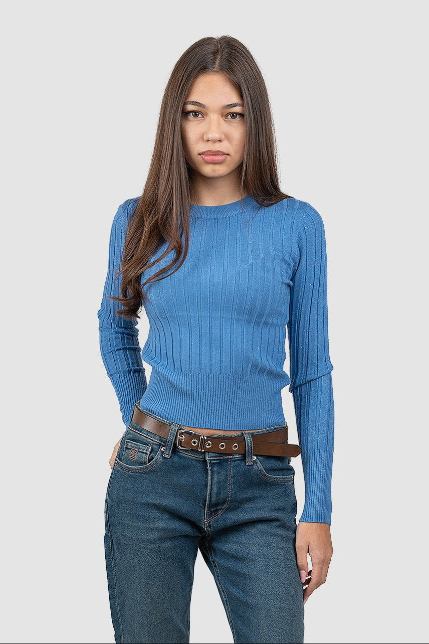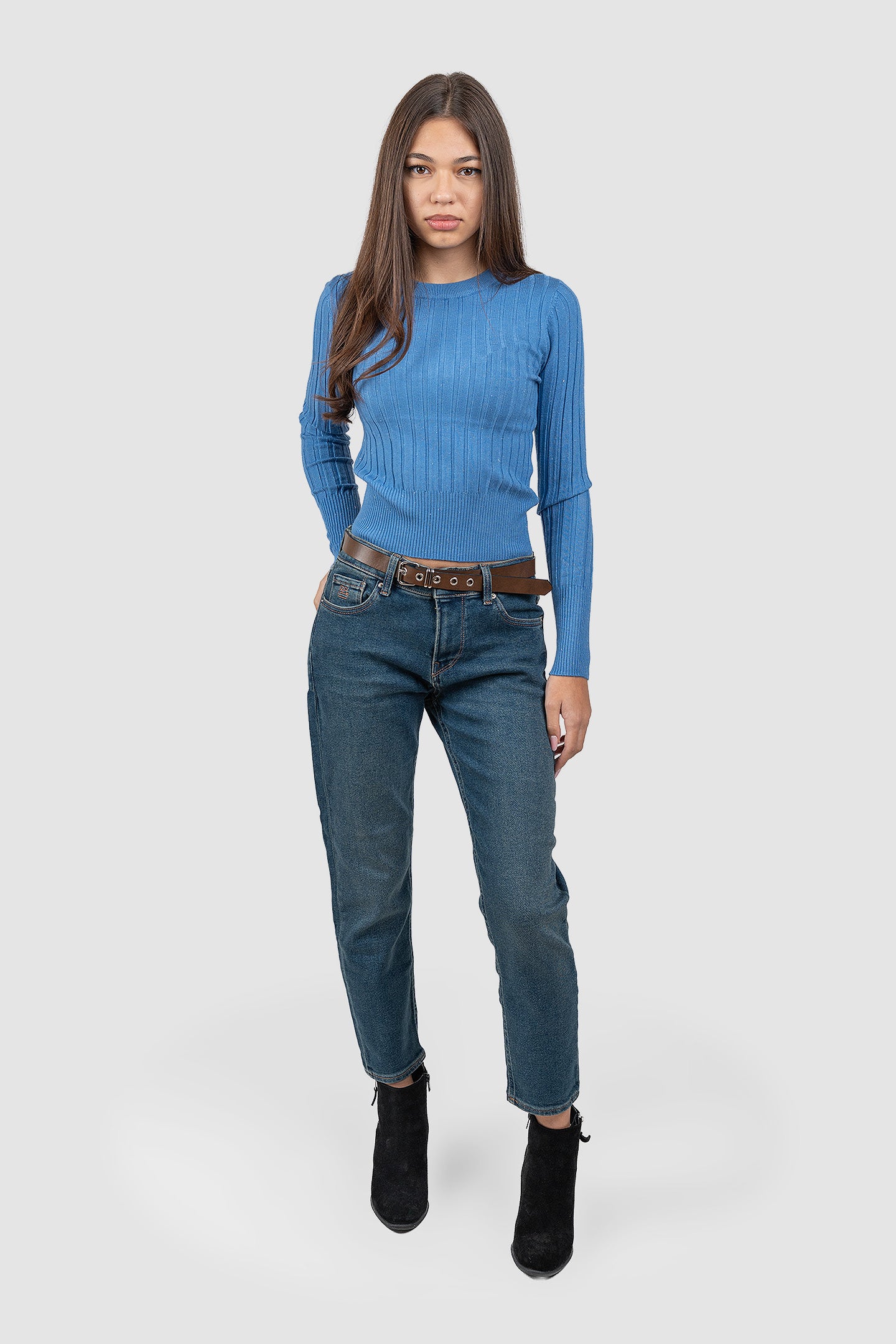 Pulover femei cu nervuri verticale și fir discret lurex, albastru