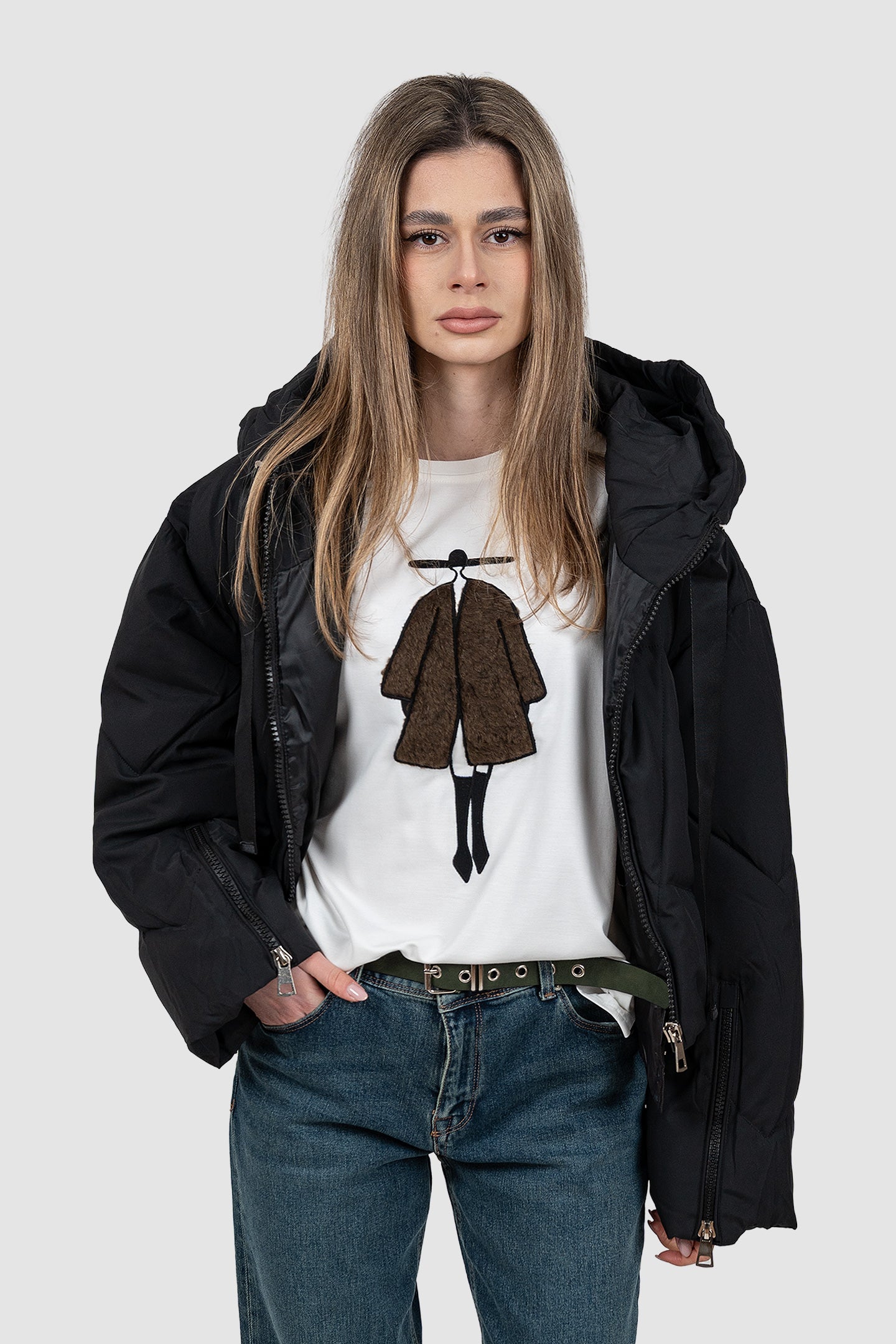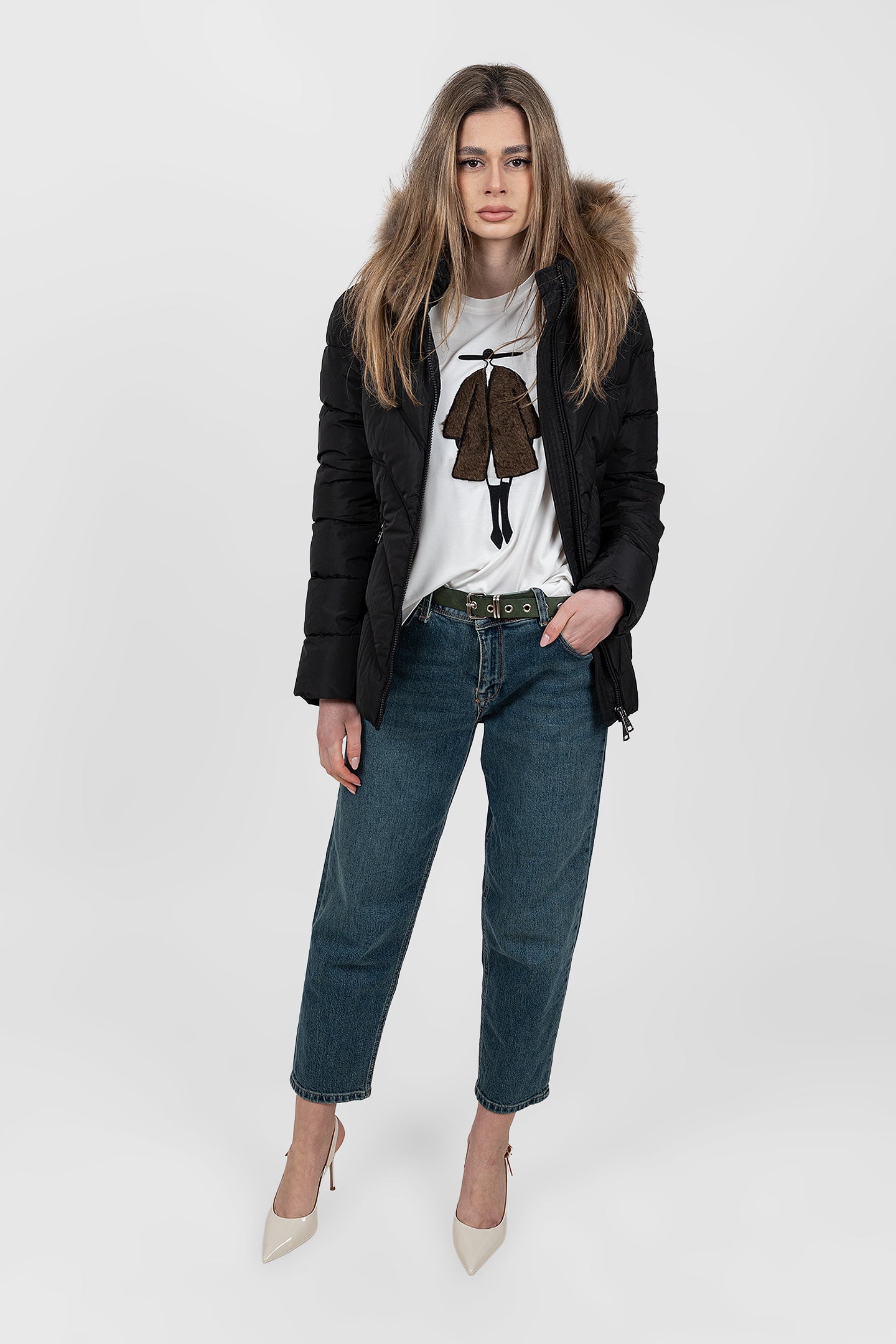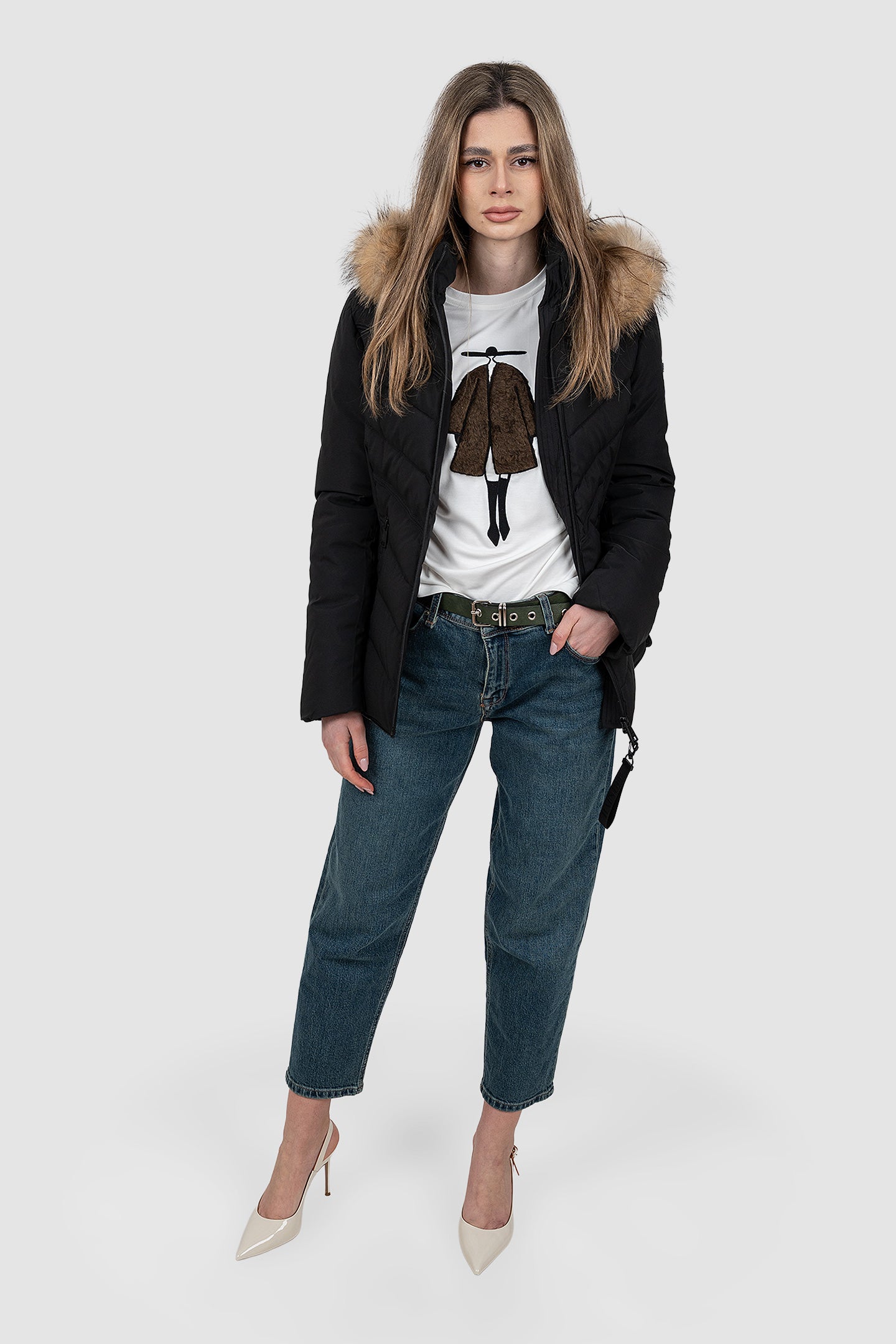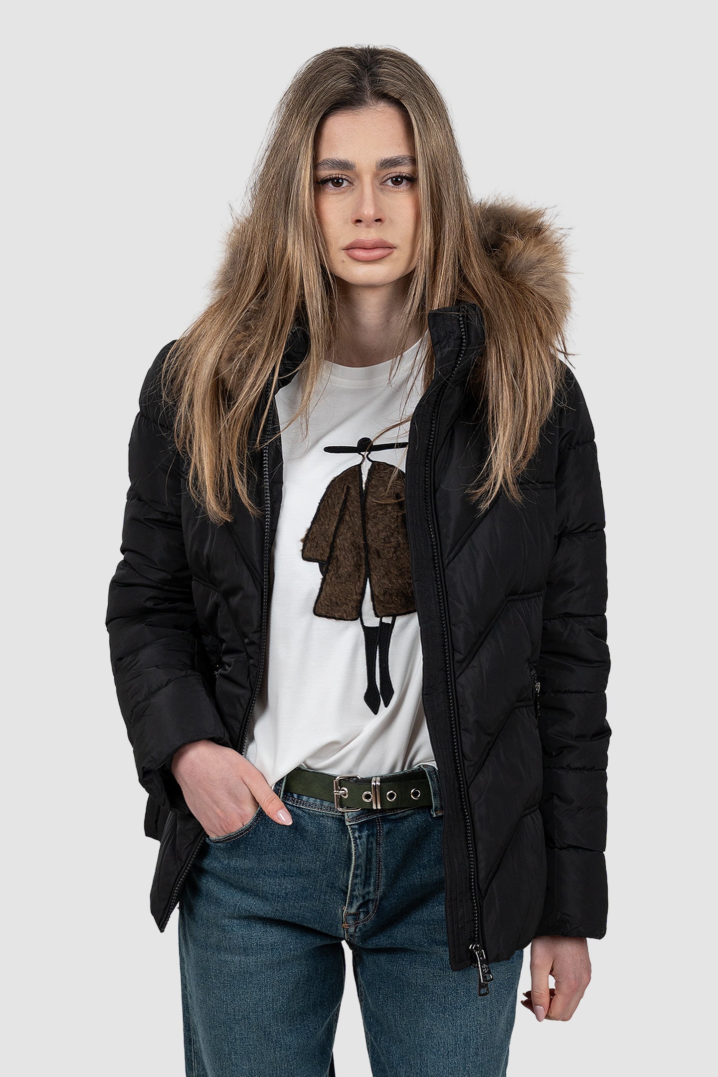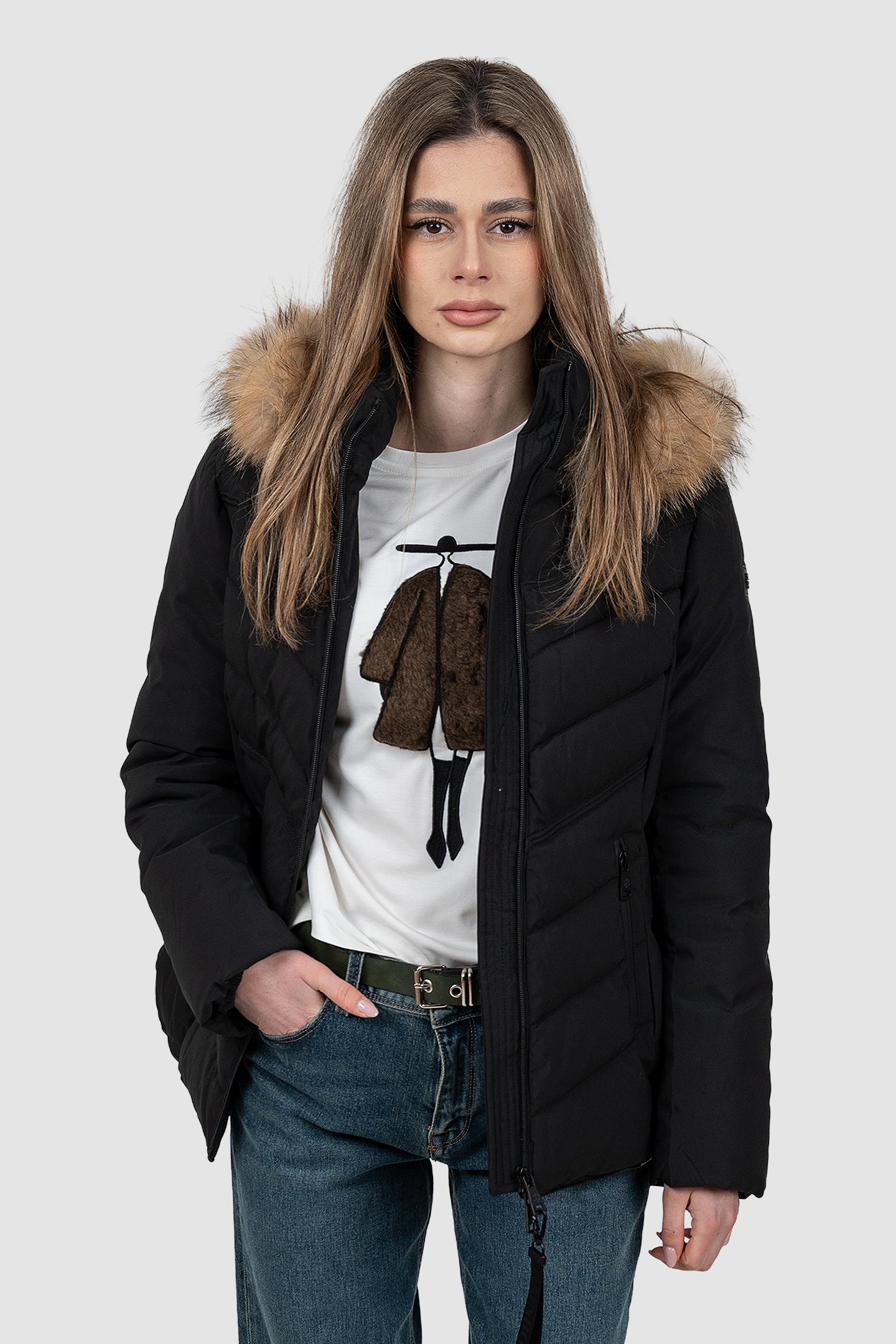 Geacă femei matlasată cu glugă și blană negru