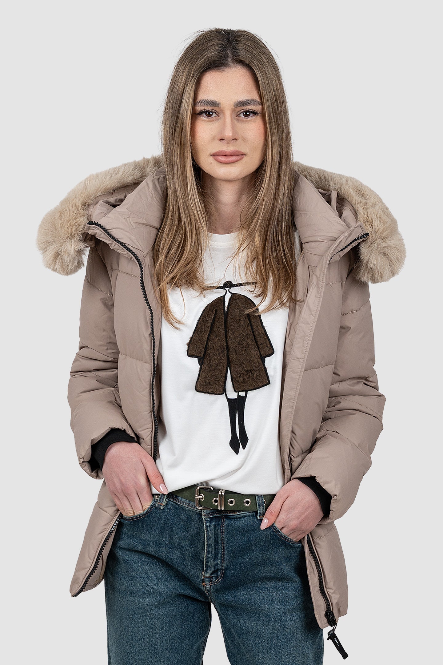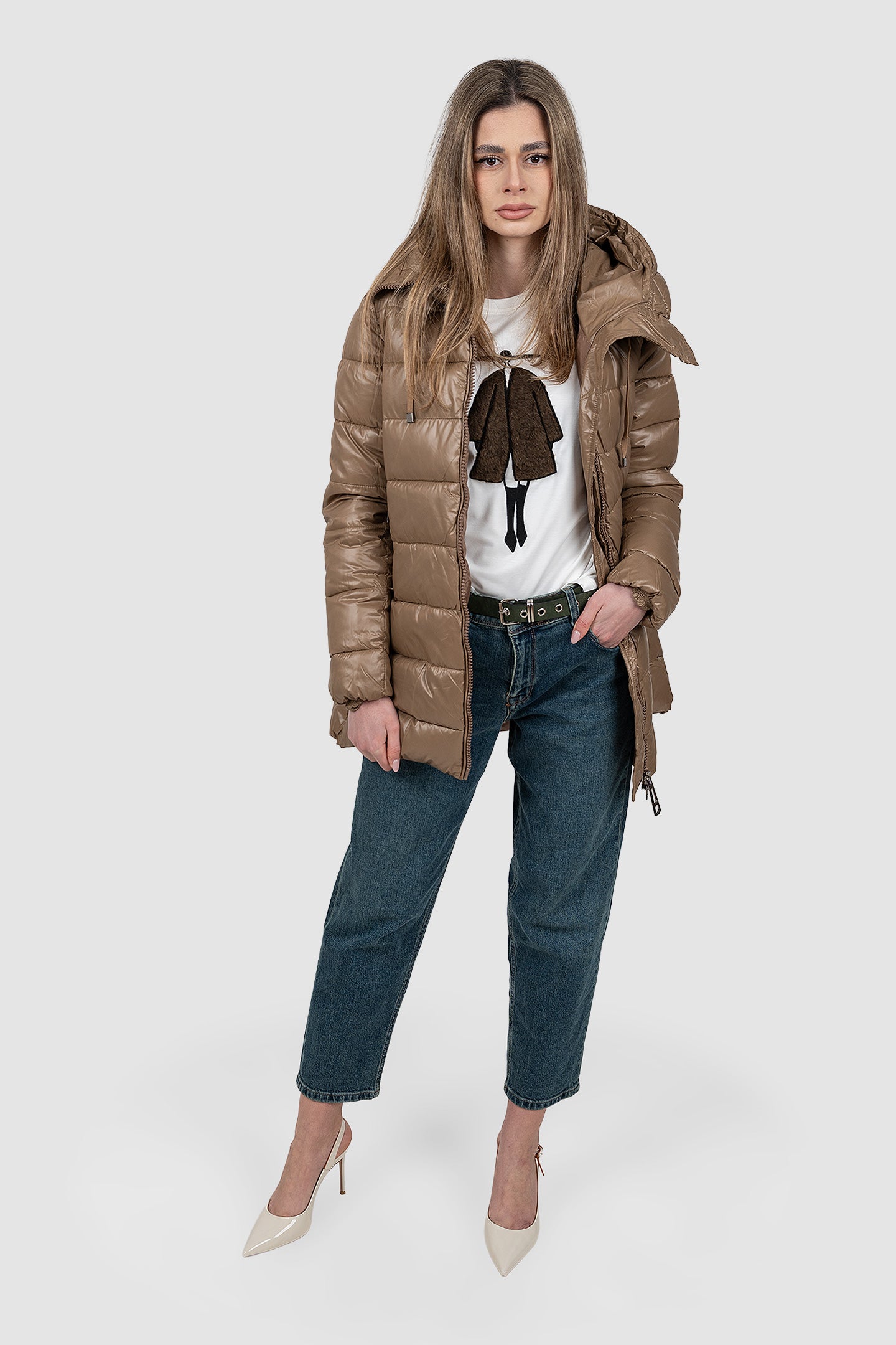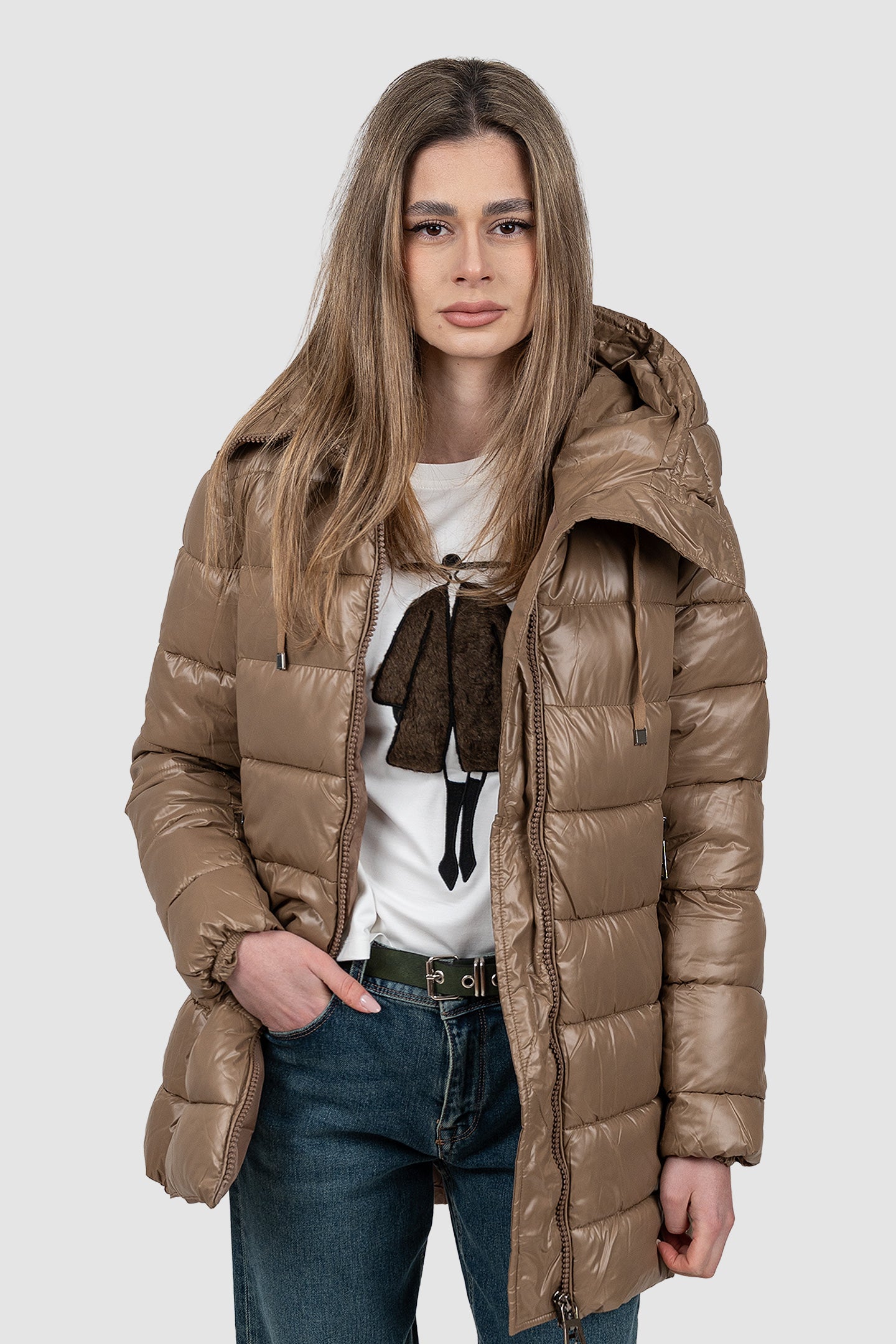 Geacă femei matlasată cu glugă bej