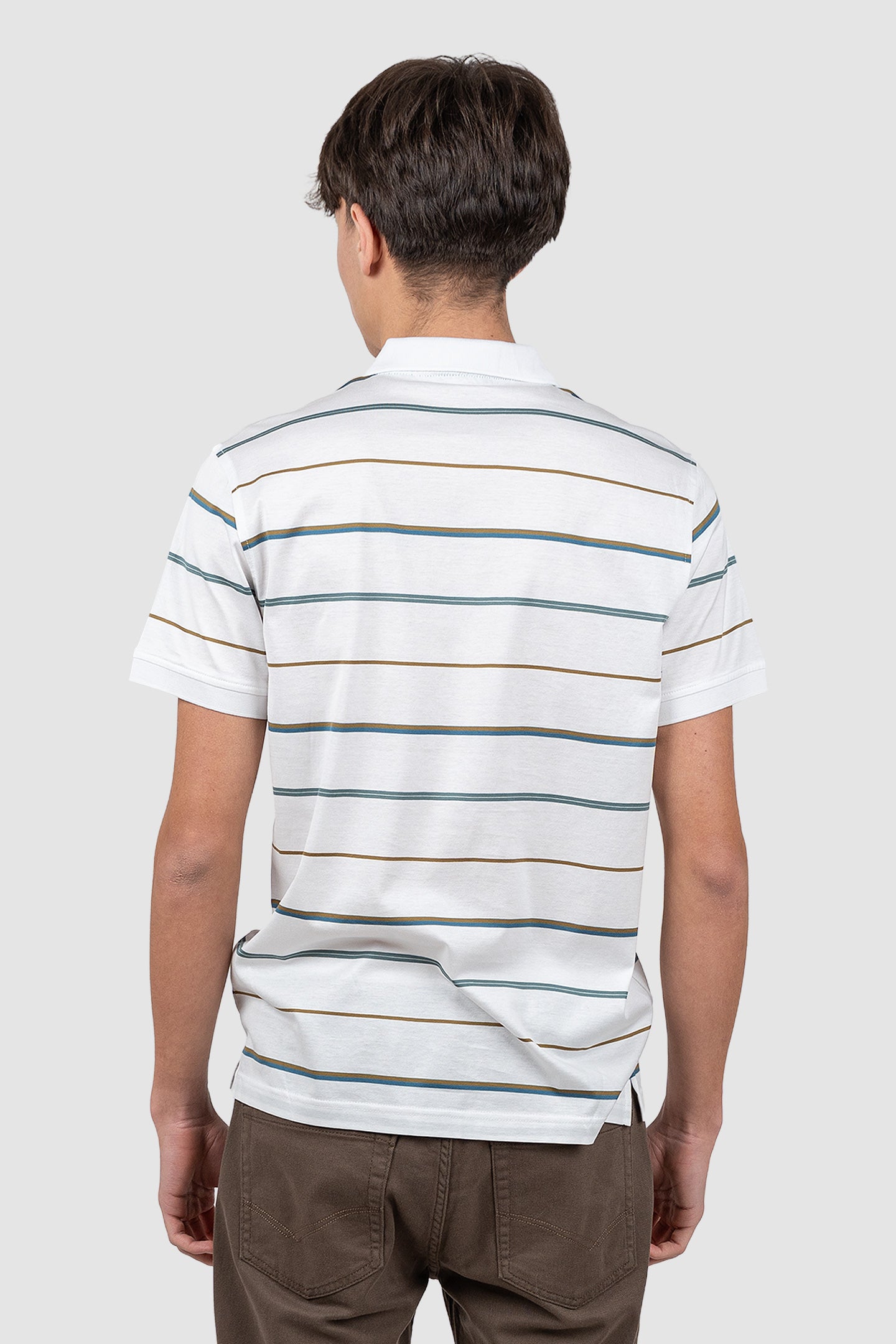 Confecționat din jerseu de bumbac cu textură fină și structură uniformă, tricoul are croială regular și linie dreaptă. Designul este evidențiat de dungi orizontale în tonuri de verde și maro, guler polo clasic și plachetă frontală cu nasturi. Logo-ul brodat pe piept completează discret aspectul.
