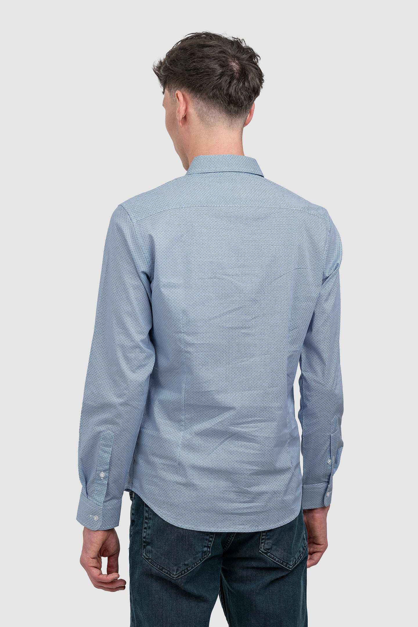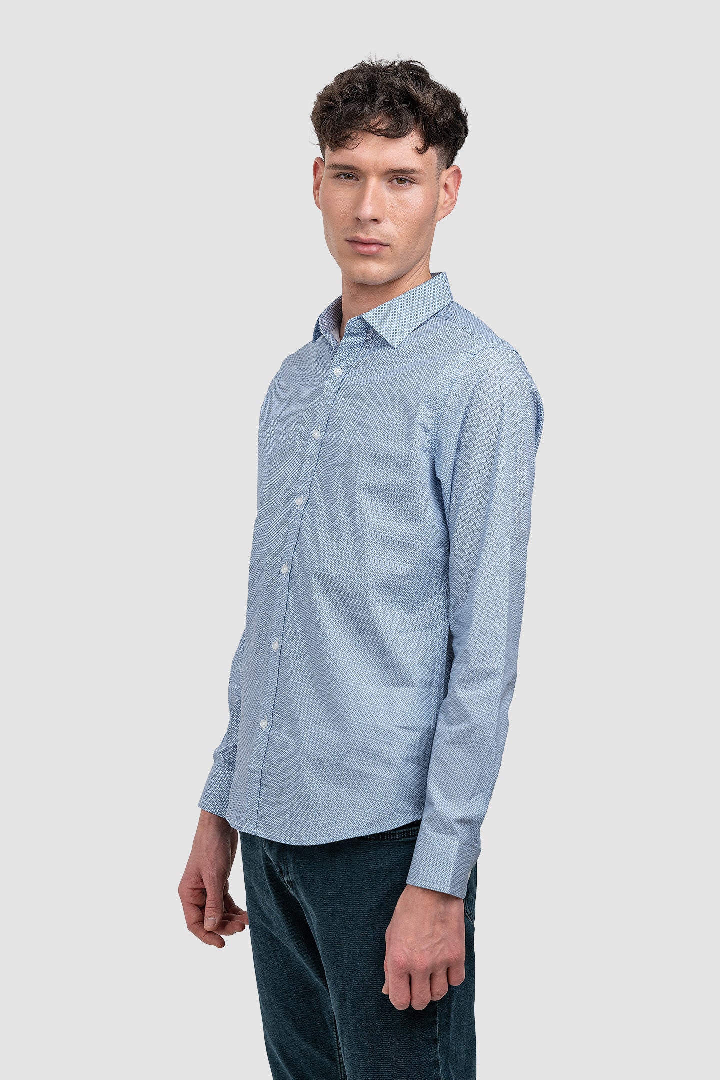 Modelul prezintă o croială slim fit, cu linie apropiată de corp, evidențiată de un imprimeu fin, repetitiv, în tonuri de albastru deschis. Gulerul clasic și finisajele curate contribuie la un aspect ordonat și ușor de integrat în ținute urbane sau de birou.