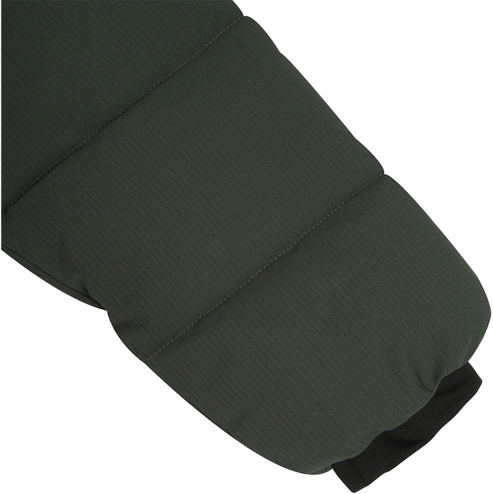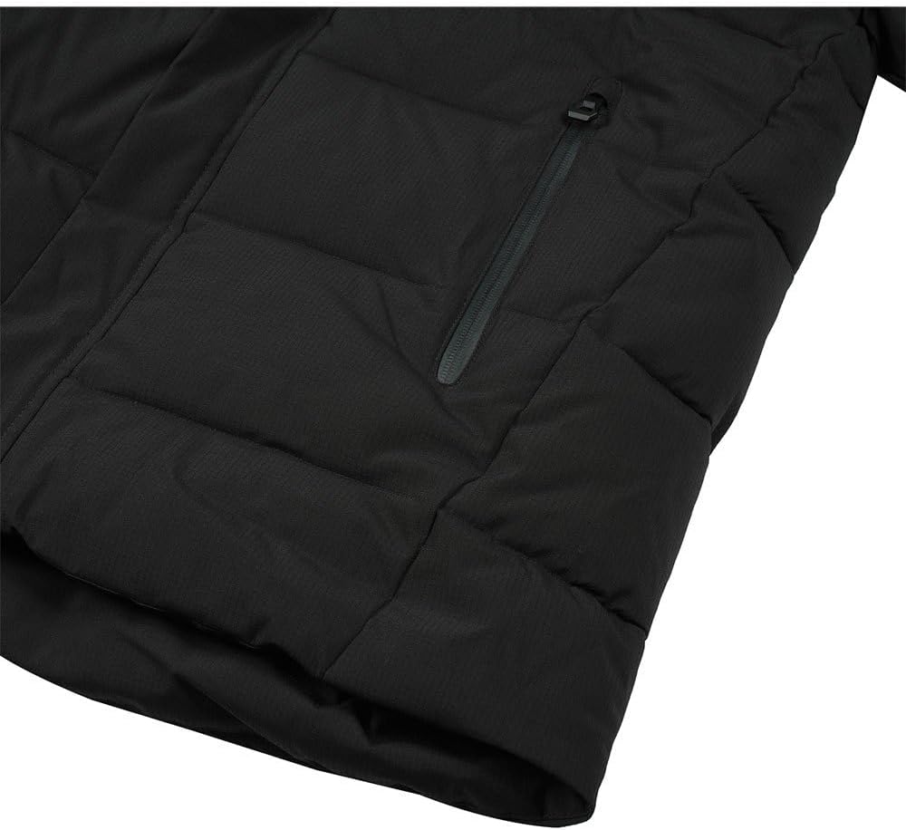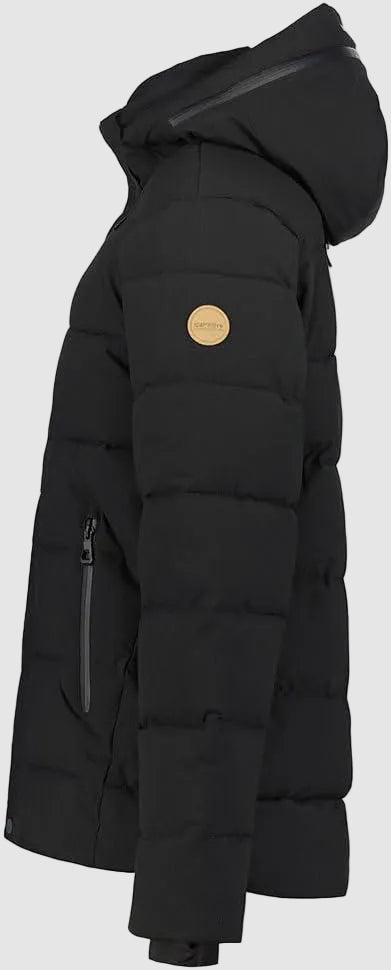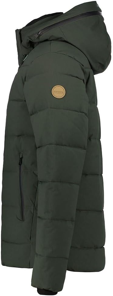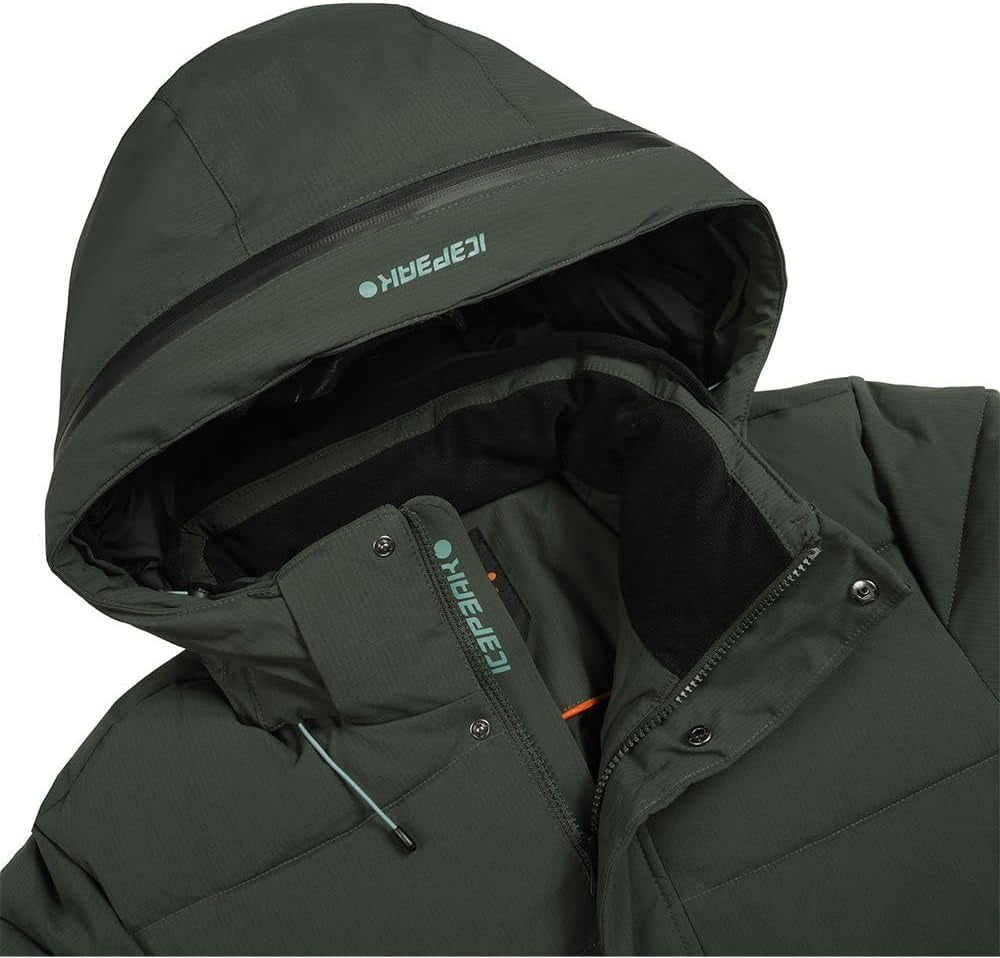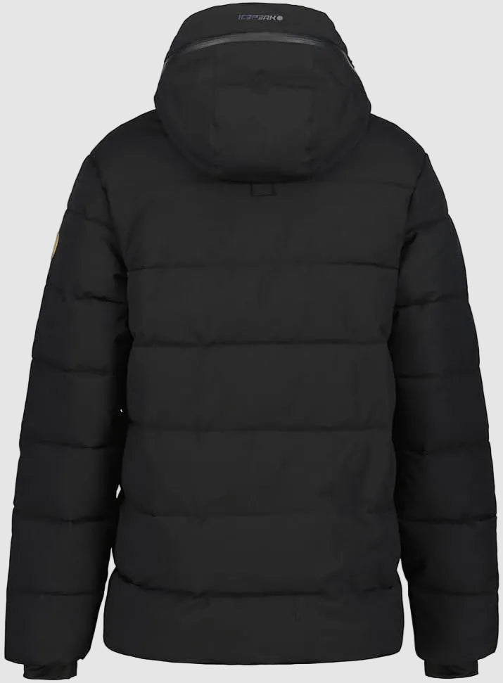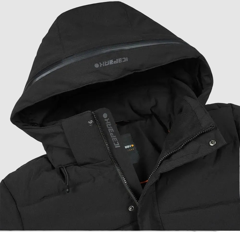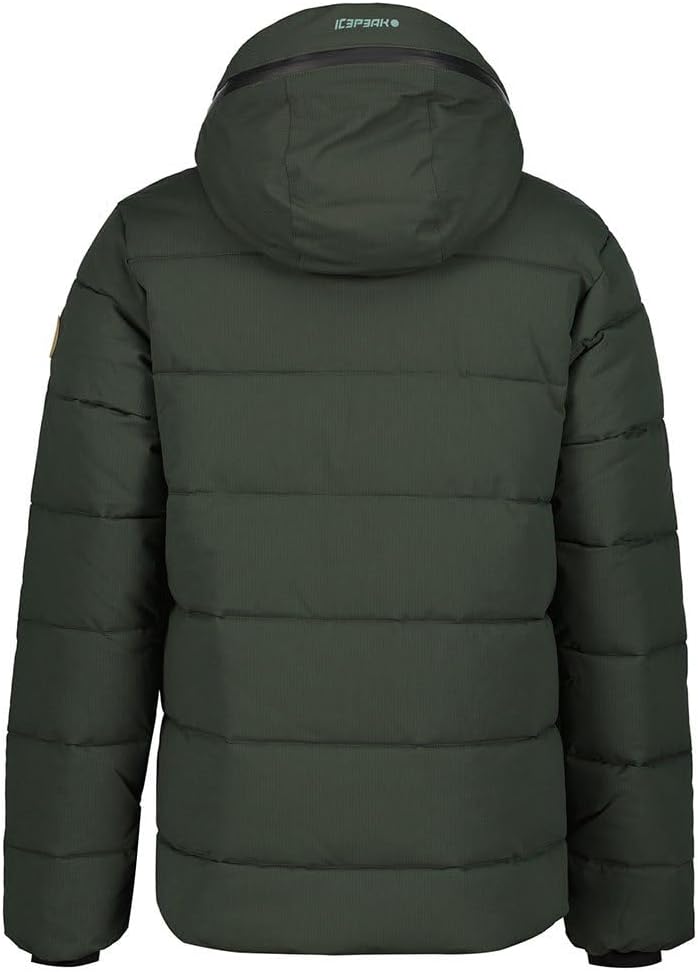 Modelul este realizat din material tehnic cu textură discretă tip ripstop, cu matlasare în panouri orizontale pentru distribuție uniformă a umpluturii. Dispune de glugă integrată, reglabilă, cu fermoar decorativ aplicat pe margine și logo Icepeak imprimat. Închiderea frontală combină fermoar ascuns și capse, iar buzunarele laterale sunt prevăzute cu fermoar impermeabil. Manșetele interioare elastice și detaliile funcționale completează construcția tehnică a gecii.