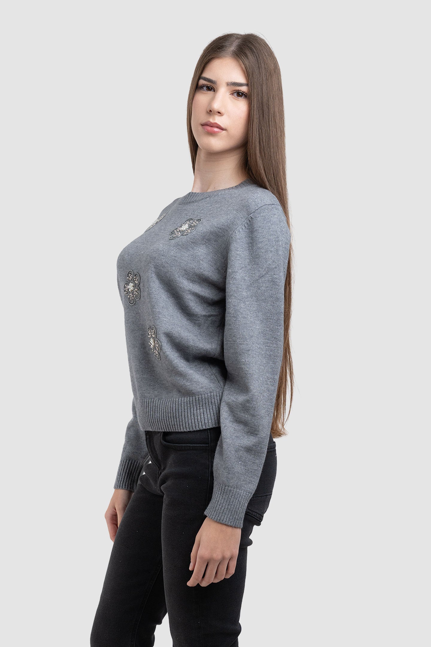 Pulover de damă gri cu aplicații florale decorative, talie unică