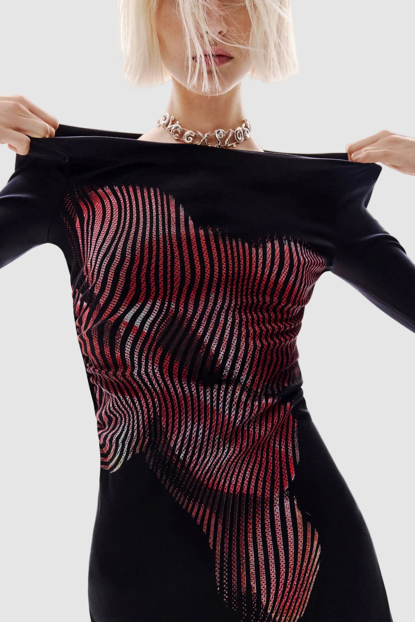 • Design: imprimeu grafic abstract frontal în tonuri de roșu și alb pe fundal negru