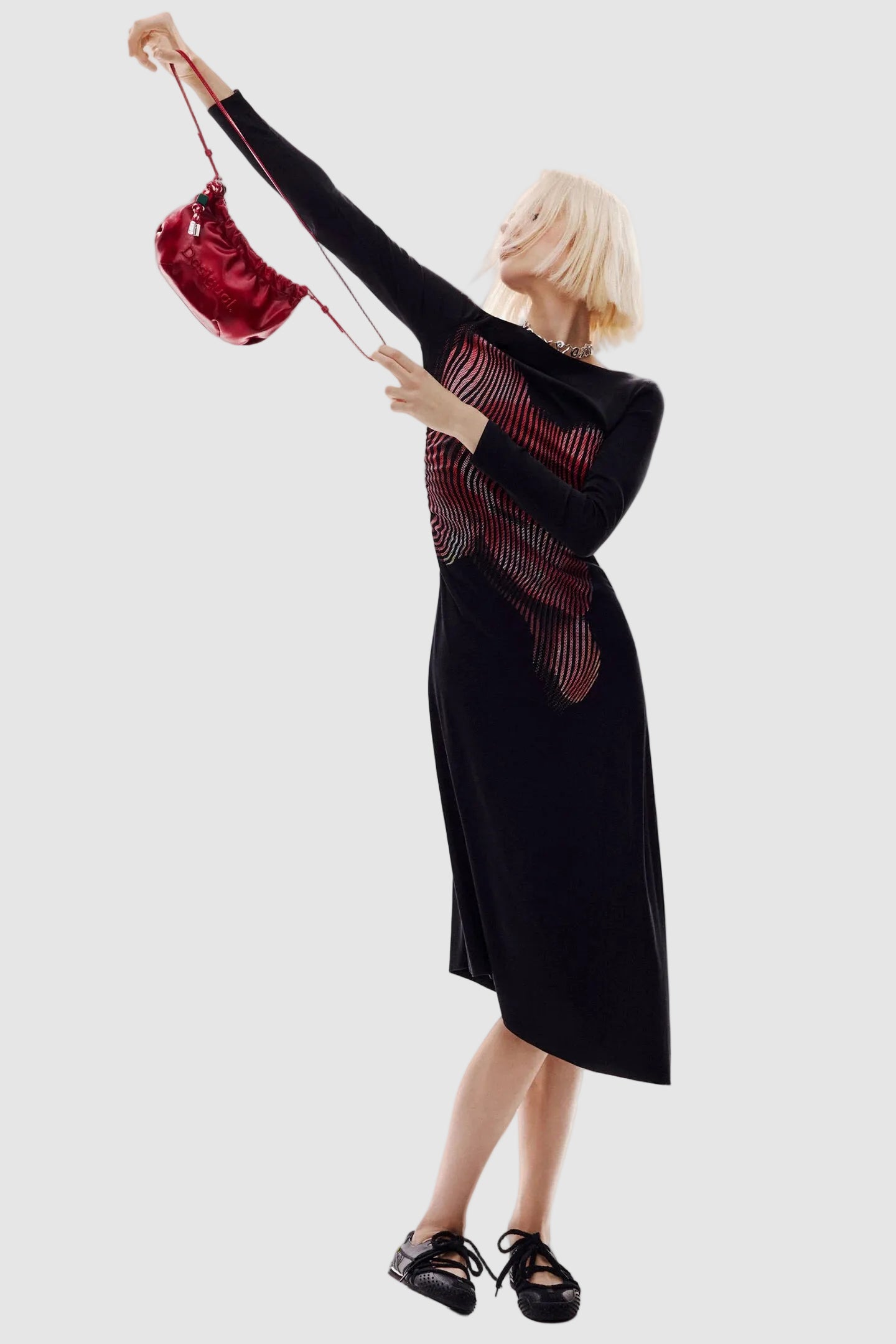 Rochie midi Desigual pentru femei, realizată din material elastic pe bază de vâscoză, potrivită pentru sezonul primăvară–vară. Designul combină o croială fluidă cu un imprimeu grafic abstract aplicat pe partea frontală, evidențiat pe fundal negru.
